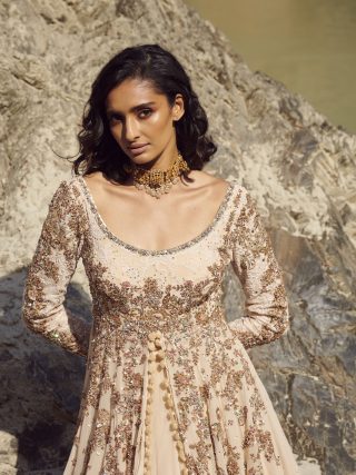 Ivory Silk Chiffon Kamdani Chikankari Jacket Teamed with a Chikankari Kamdani chiffon Lehenga & organza dupatta