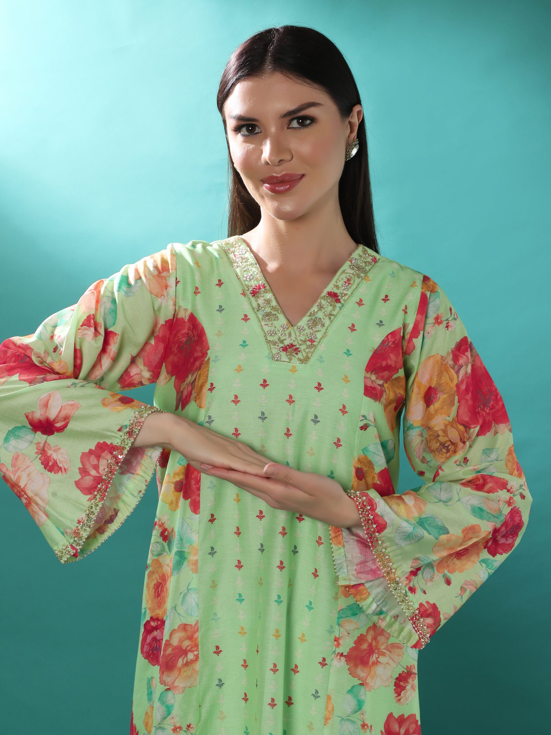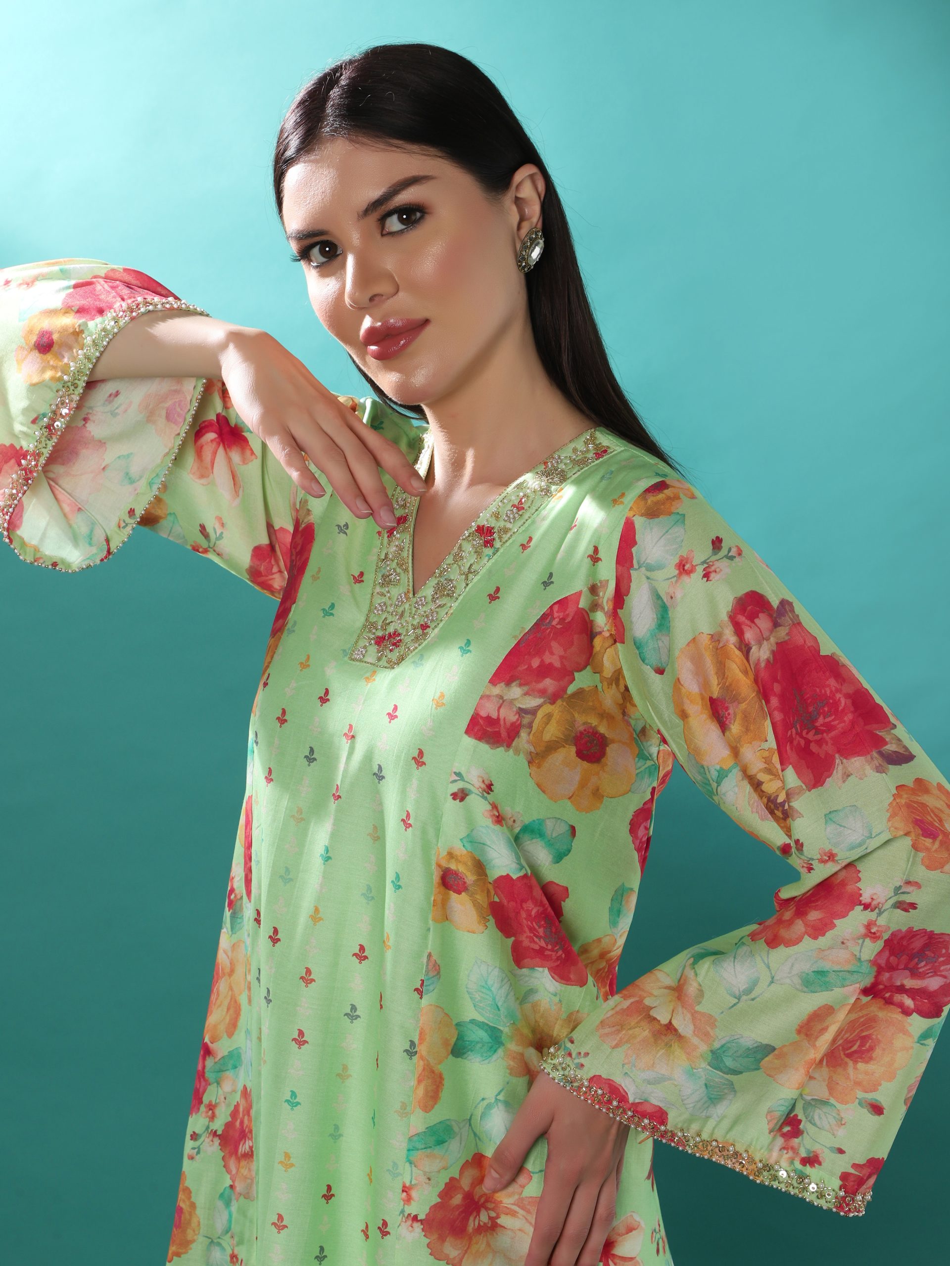 Mint chanderi tunic with zari work on neckline and sleeve. Comes with pants .