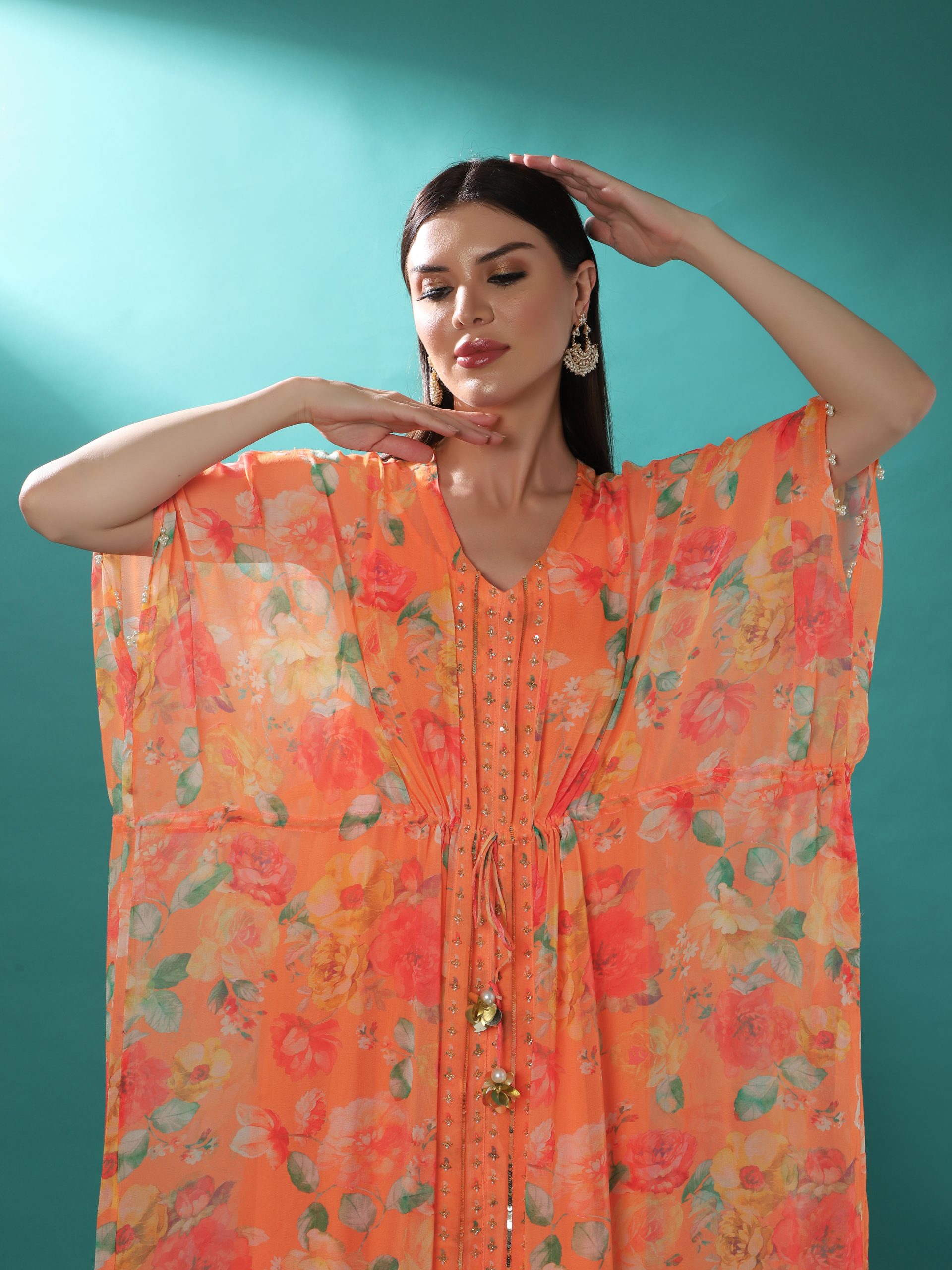 Orange georgette kaftan dress is embroidered using sequins, cutbeads and pearls and has a tie on the waist. Comes with a shantoon inner.