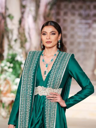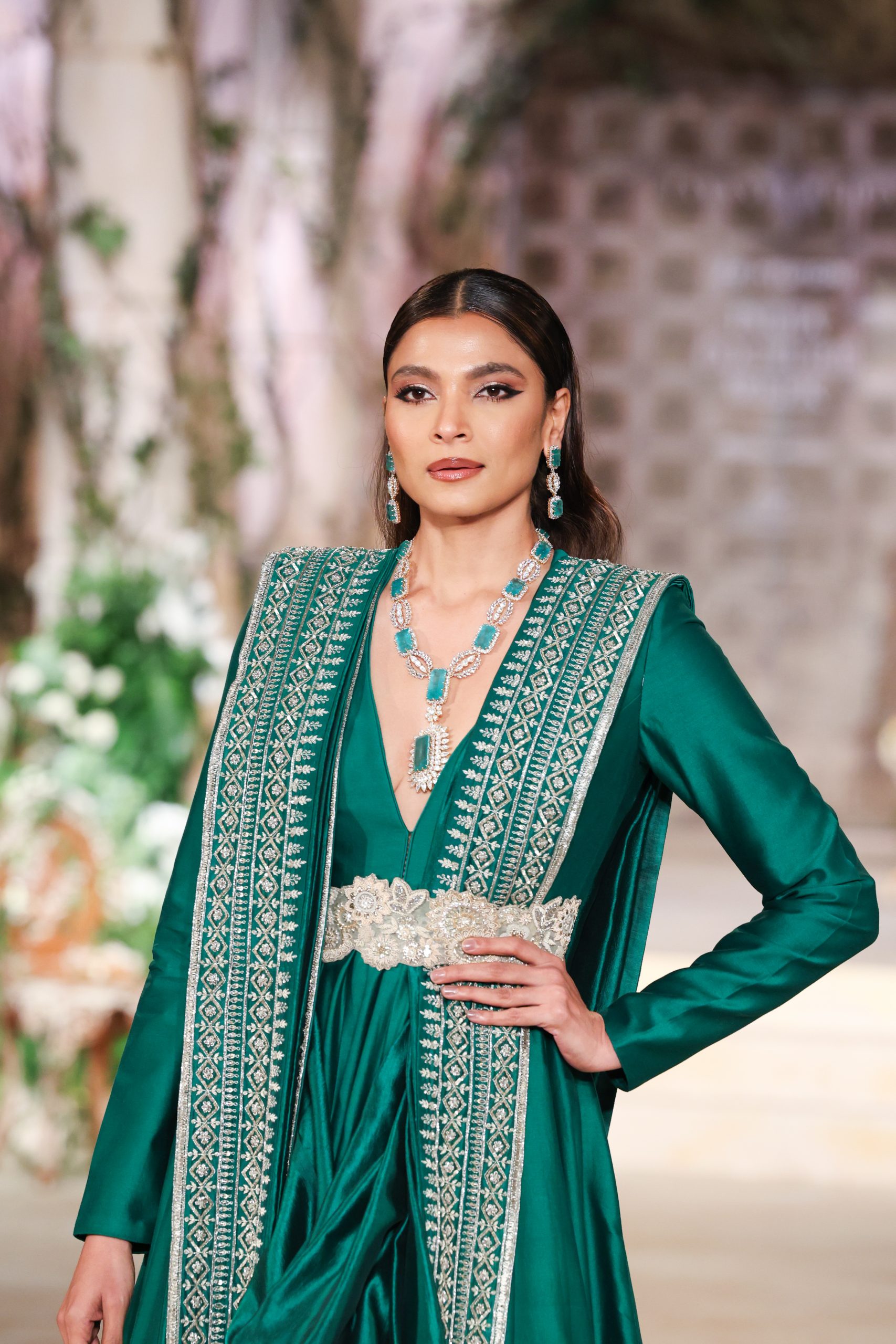 An anarkali paired with a saree and belt, crafted on a silk base and intricately hand-embroidered in zardozi.