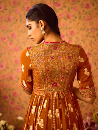 Mustard yellow hand embroidered silk brocade anarkali suit with embroidered belt and silk organza dupatta.