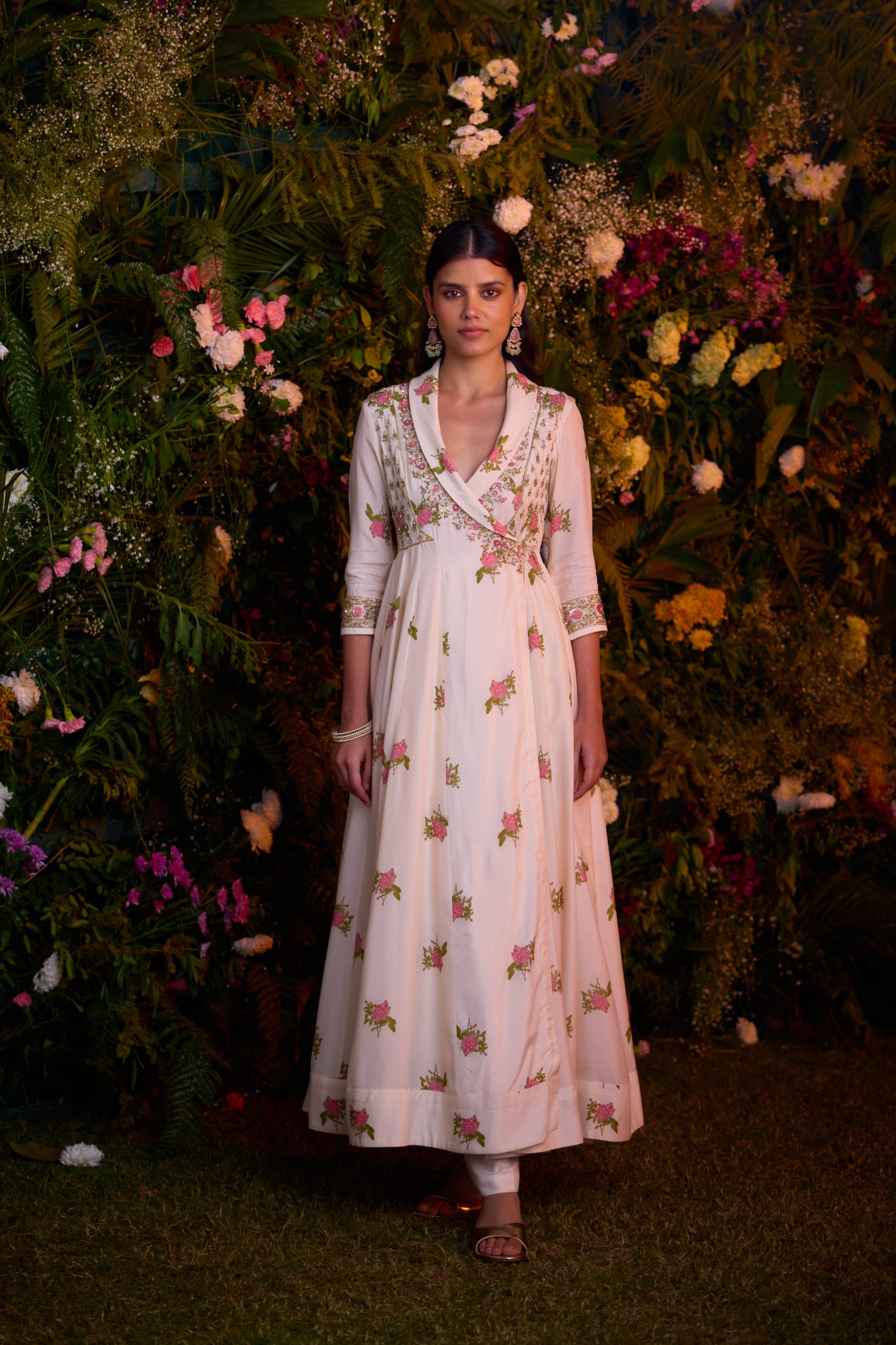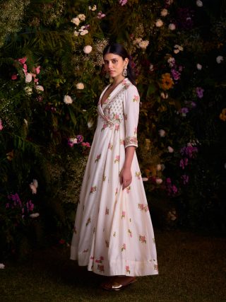 Ivory hand block printed zardozi embroidered angrakha with pants.
