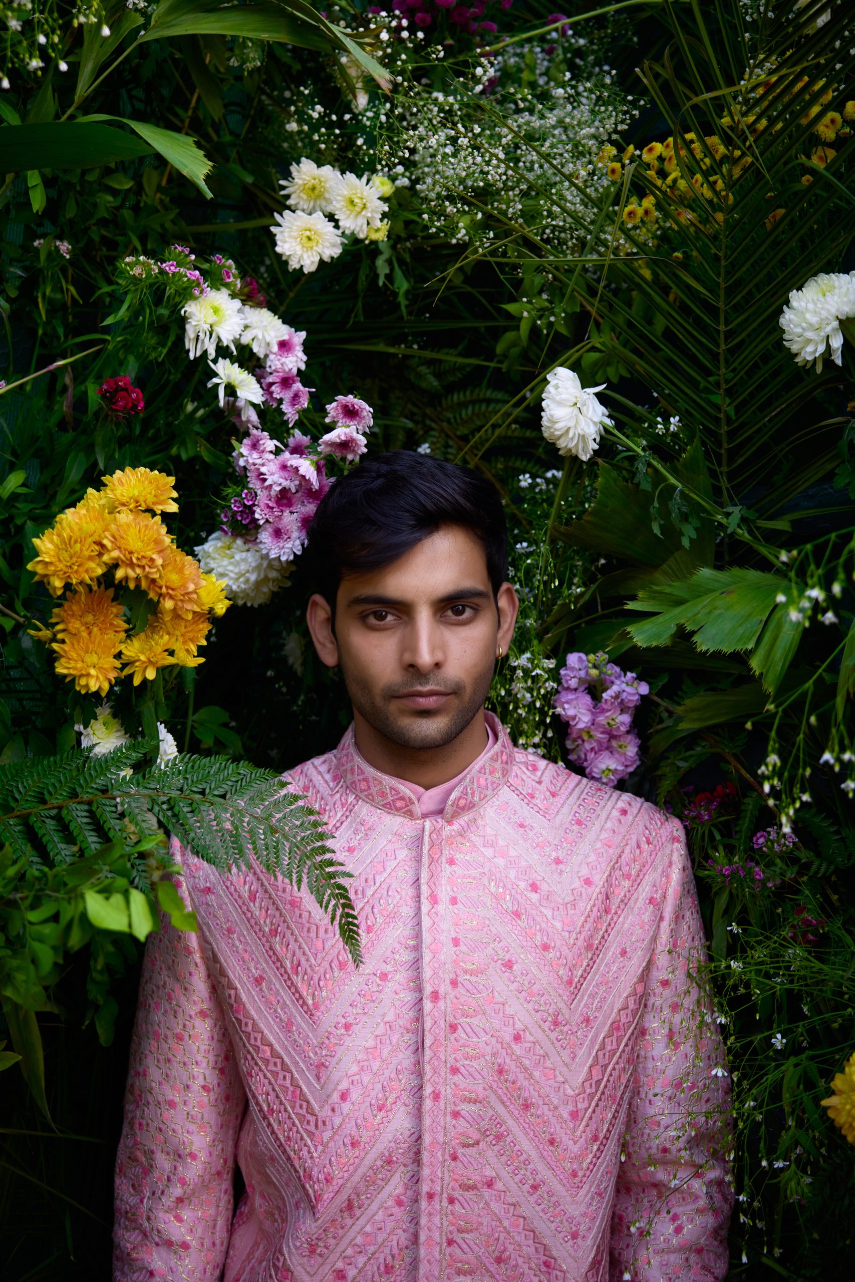 Coral pink raw silk thread and zari embroidered bandhgala with plain kurta and trousers.