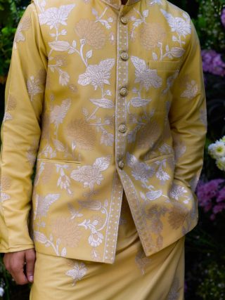 Lemon drop yellow cotton silk gold and silver lurex patch work and thread embroidered waist coat and kurta set.