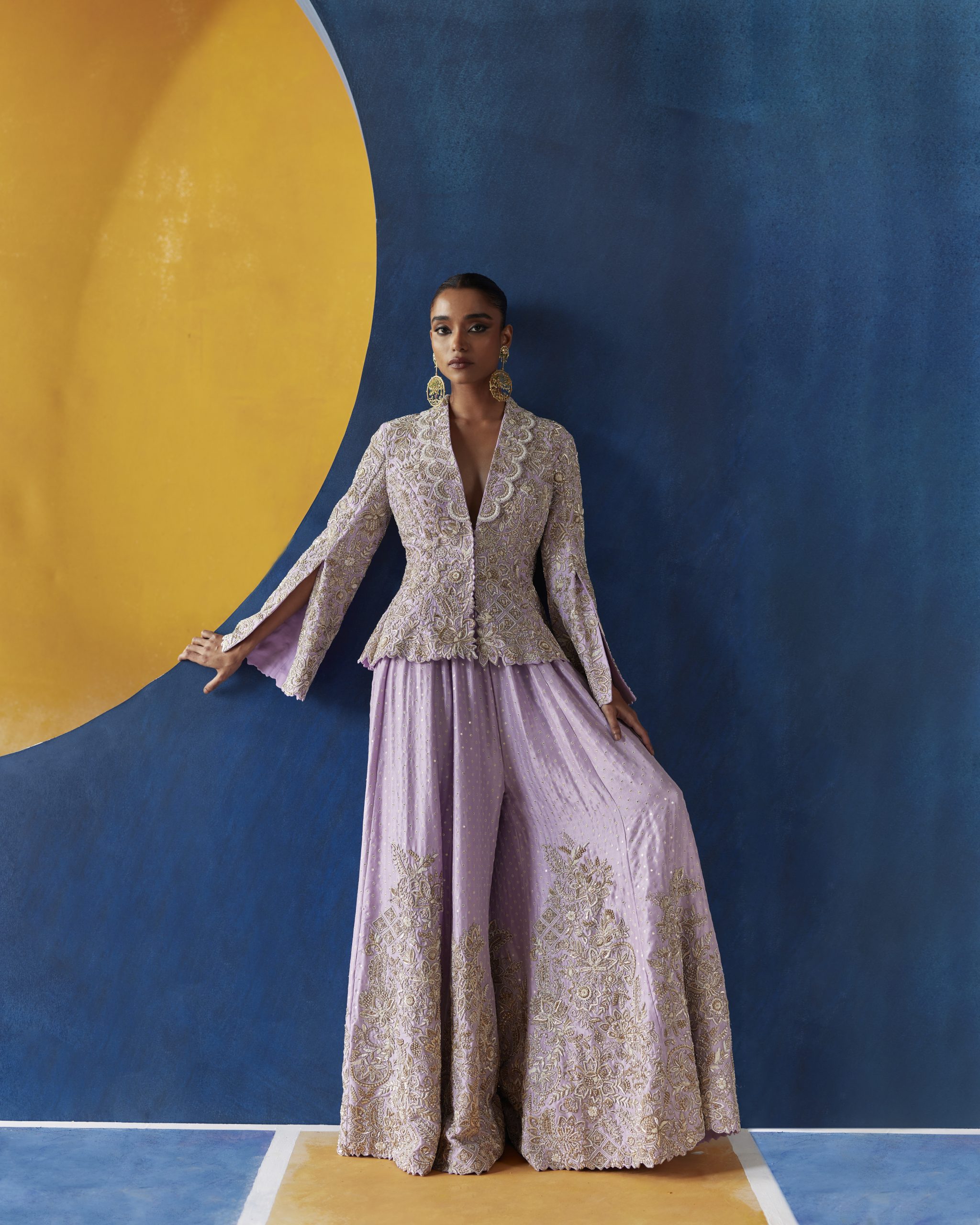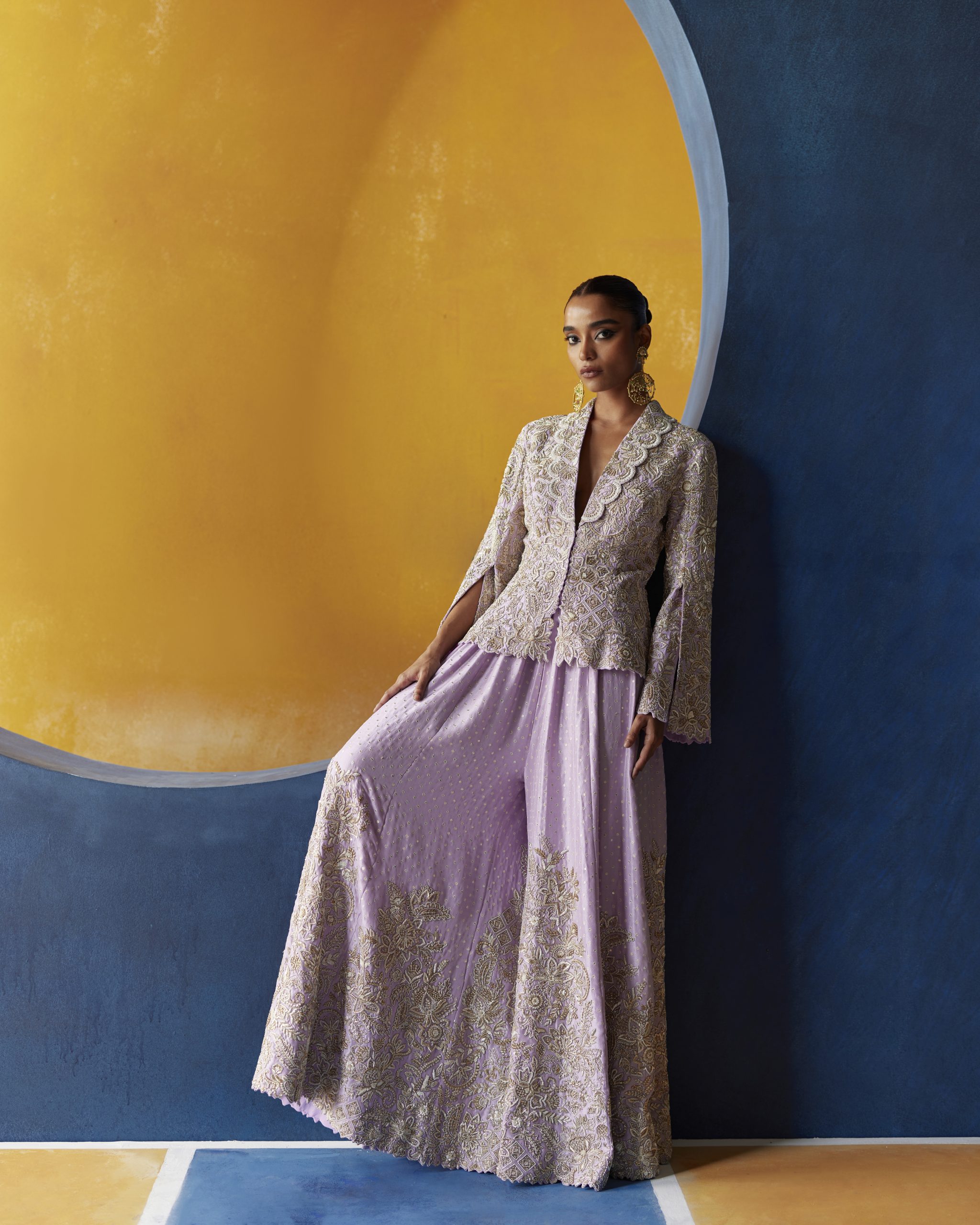 Lilac shawl collar jacket with off-white resham, pearl, and zardozi embroidery all over. Paired with lilac gathered palazzo pants with sequence texture and off-white resham, pearl, and zardozi embroidery at the hemline.