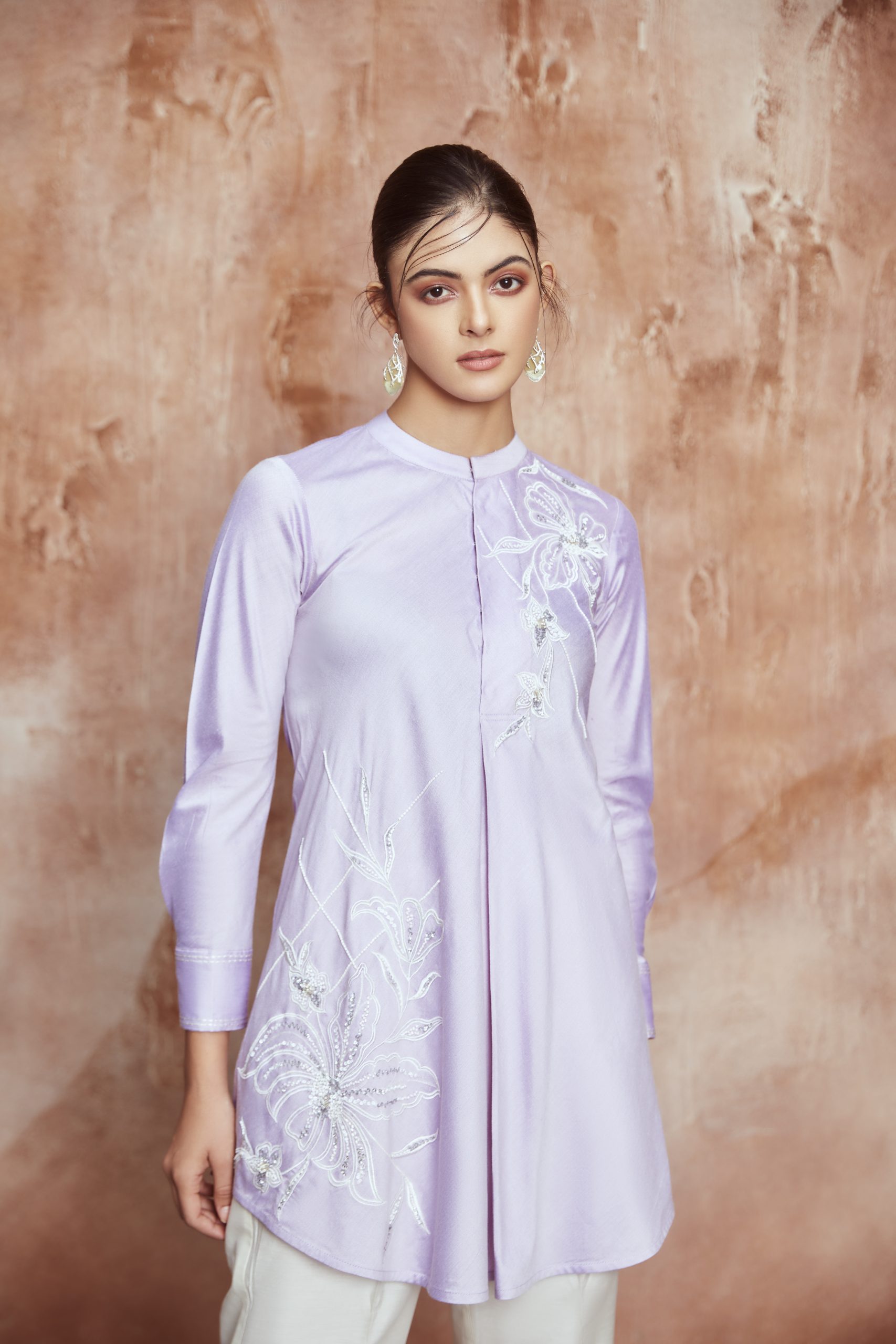 Featuring tunic with bell bottom pants in spun cotton fabric with resham and hand sequence embroidery.