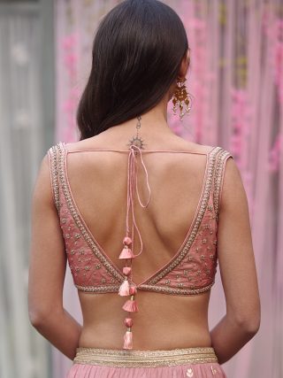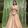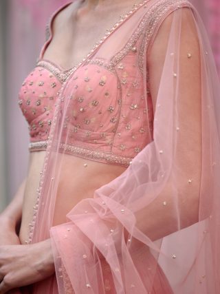 Zardozi embroidered lehenga on multi-colored chanderi brocade base with a belt and embroidered net dupatta.