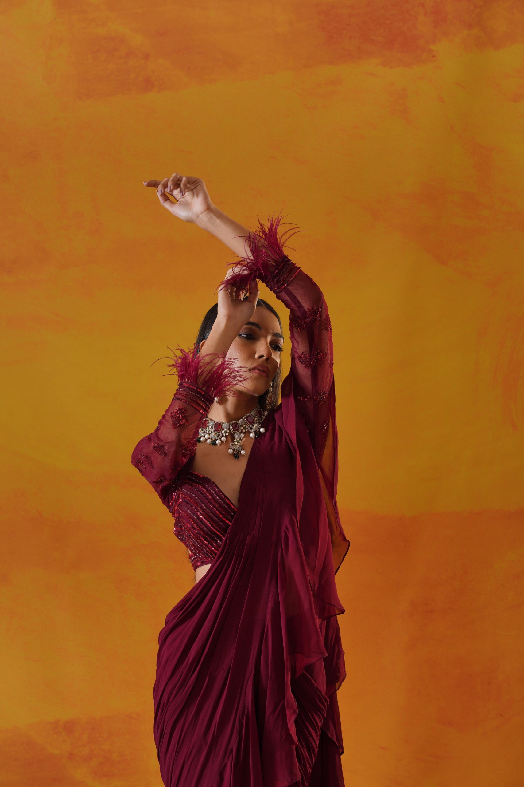 Kapda Dori’s stunning maroon ready to wear ruffle saree. The maroon color adds a touch of glamour and sophistication to your look, while the soft georgette ensures you feel comfortable all day or night long. It is styled with a maroon net blouse fully embroidered with beads, cutdana and sequins with feather details on sleeve cuff.