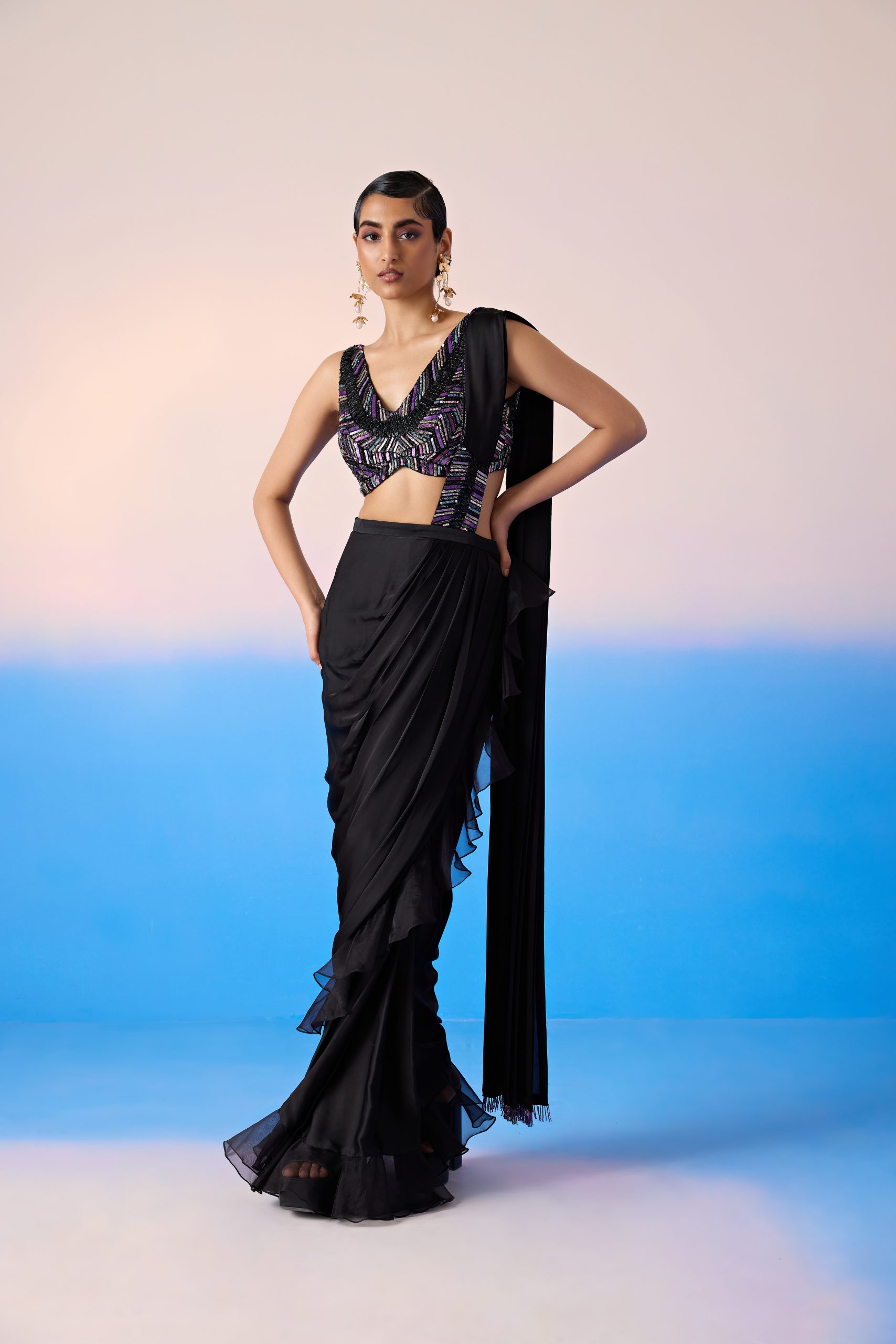 Heavy embroidered blouse with drape saree.