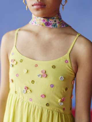 A solid lime yellow dress with an embroidered yoke ornamented with 3D crochet flowers. Zig zag gtiered flare. Adjustable straps and pockets