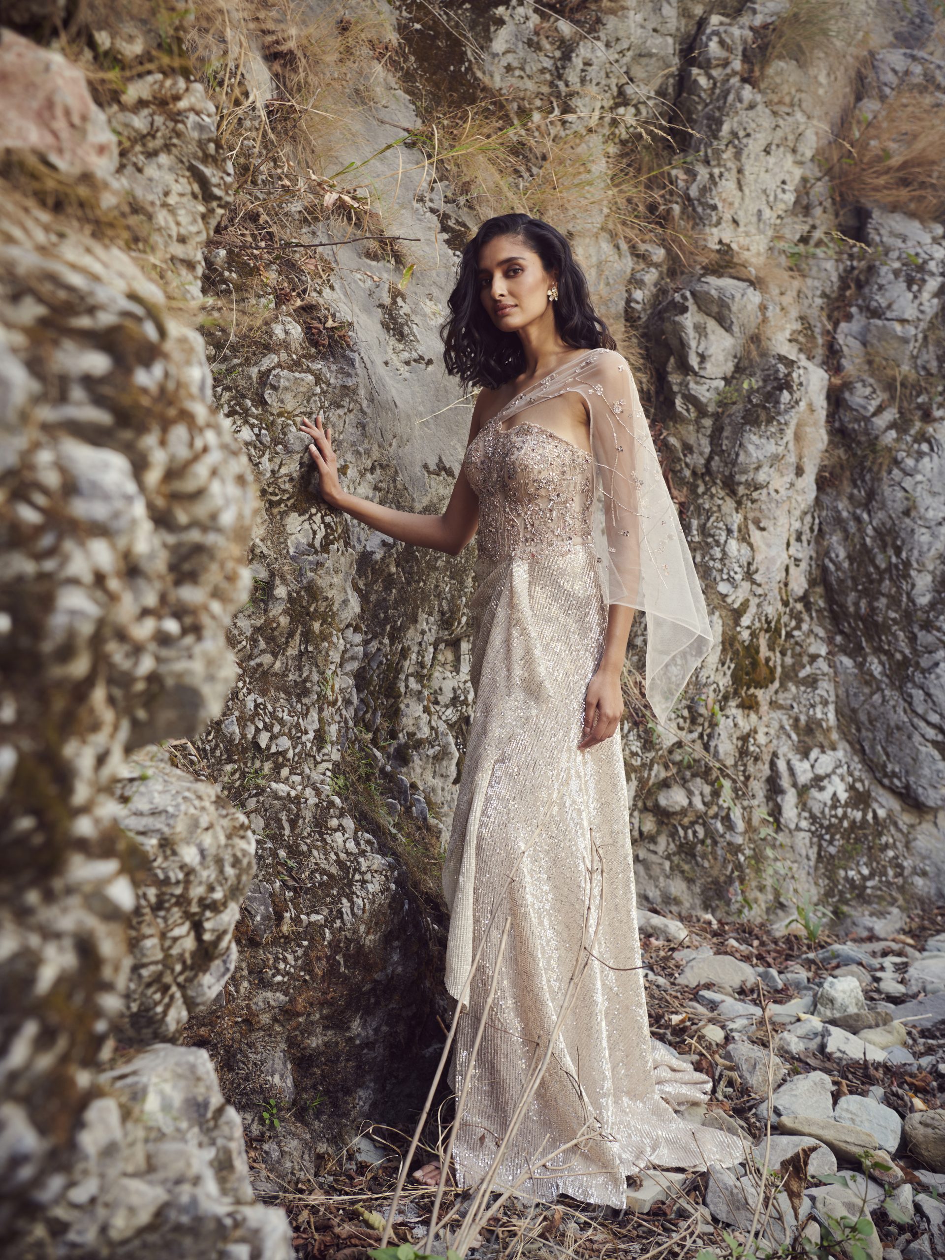 Ivory Tulle sequined draped asymmetrical gown highlighted with Japanese Cut-dana