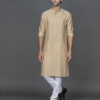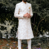 The New-Age Construction; this progressive bandhgala in bottle green is engineered with curved sculpted contrast silk strips on the shoulders. The creation is paired with matching straight trousers.