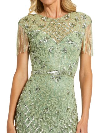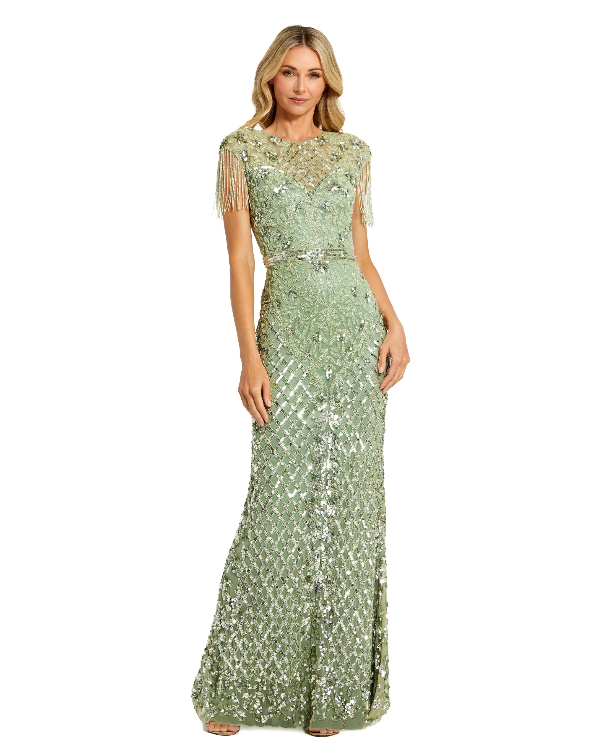 Mac Duggal Hand-embellished mesh overlay; 100% polyester lining Partially lined bodice; fully lined skirt; semi-sheer unlined sleeves Illusion high neckline Beaded fringe cap sleeves.