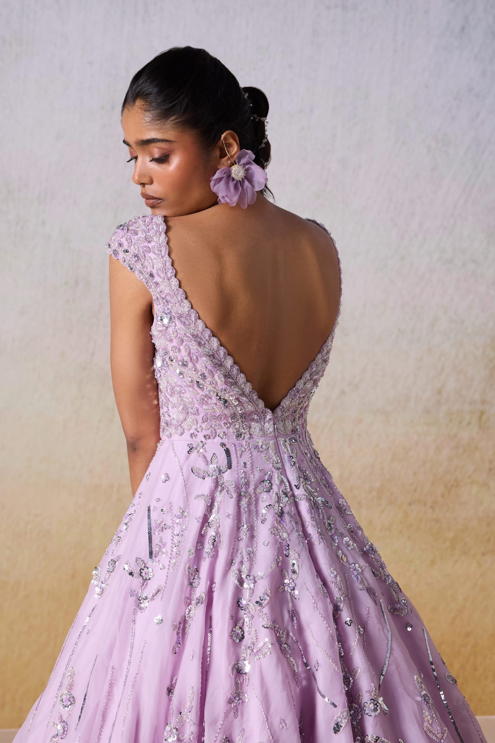 Silver With Tone On Tone Embellishment On A Deep Curved V Neck Gown Featuring With A Scattered Floral Motifs On The Flare.