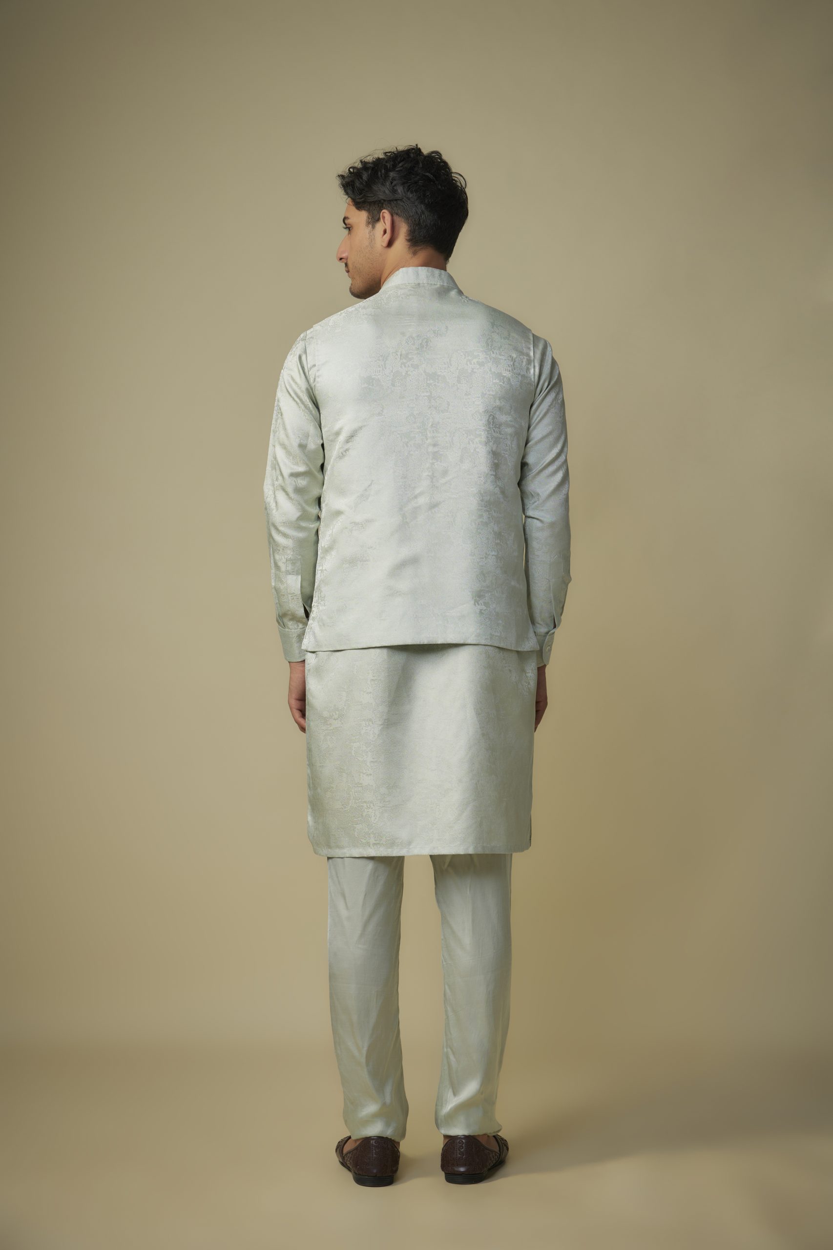 Featuring sage green jacquared bundi with kurta with mashroo pant.