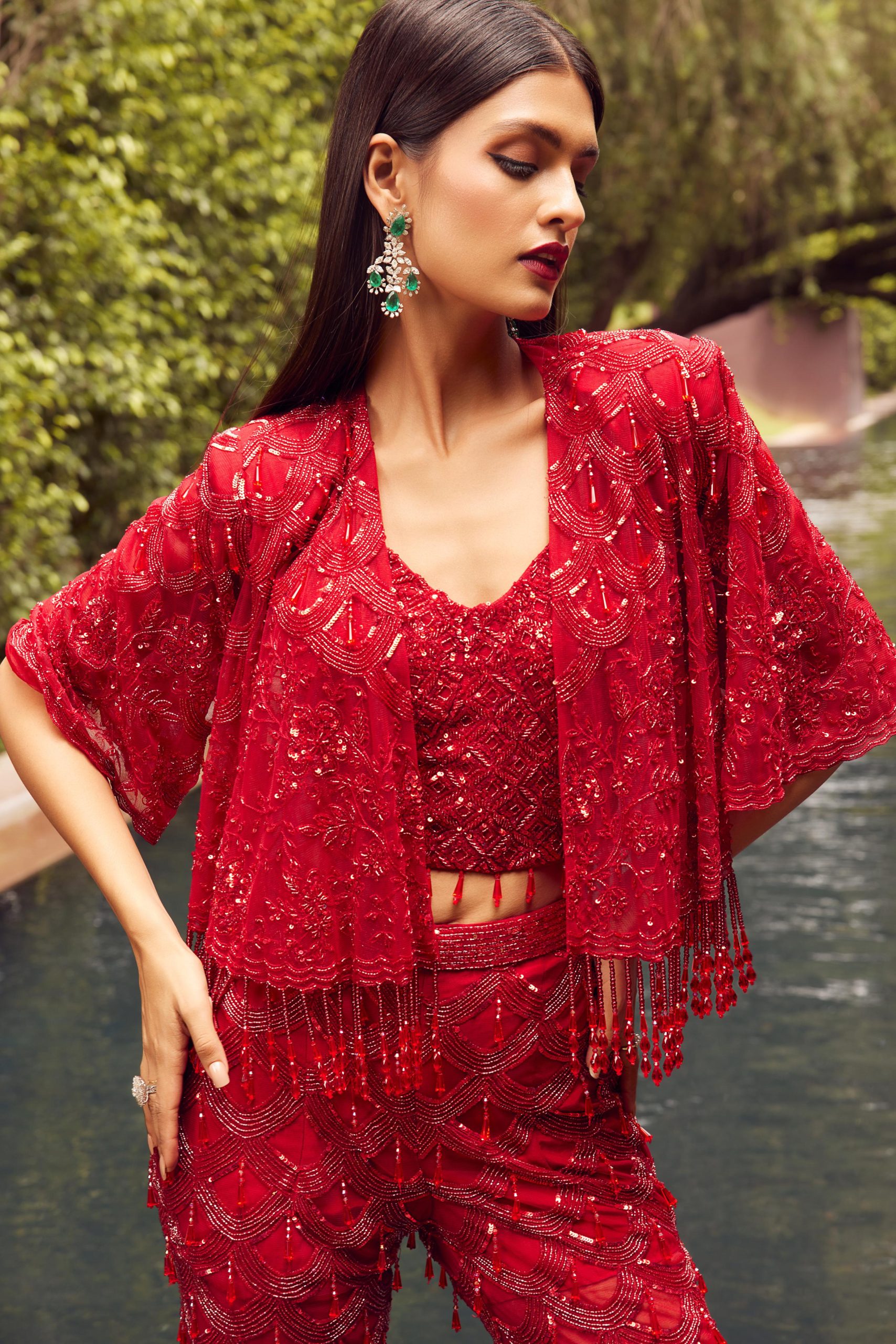 Red net cape jacket with crystal tassle emeblishments all over paired with heavily embroidered pants and bustier.