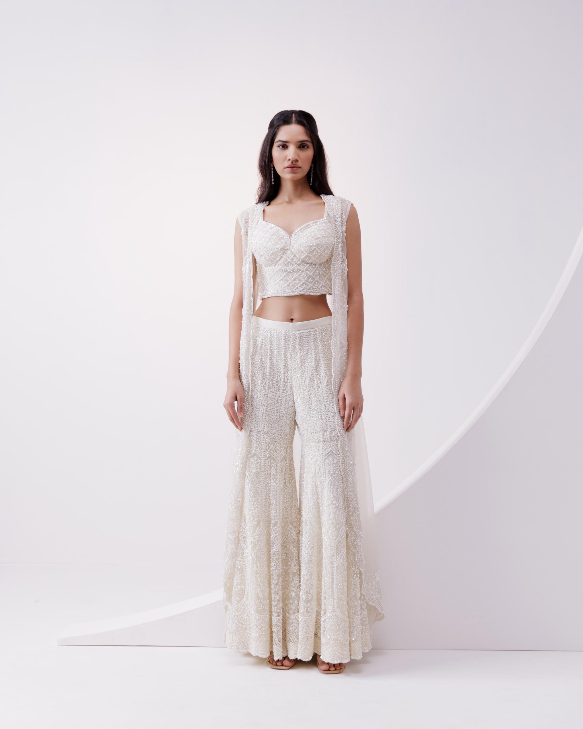 Ivory net jacket and sharara set with tonal pearl, bead and sequins embroidery paired with embroidered blouse.