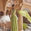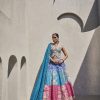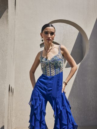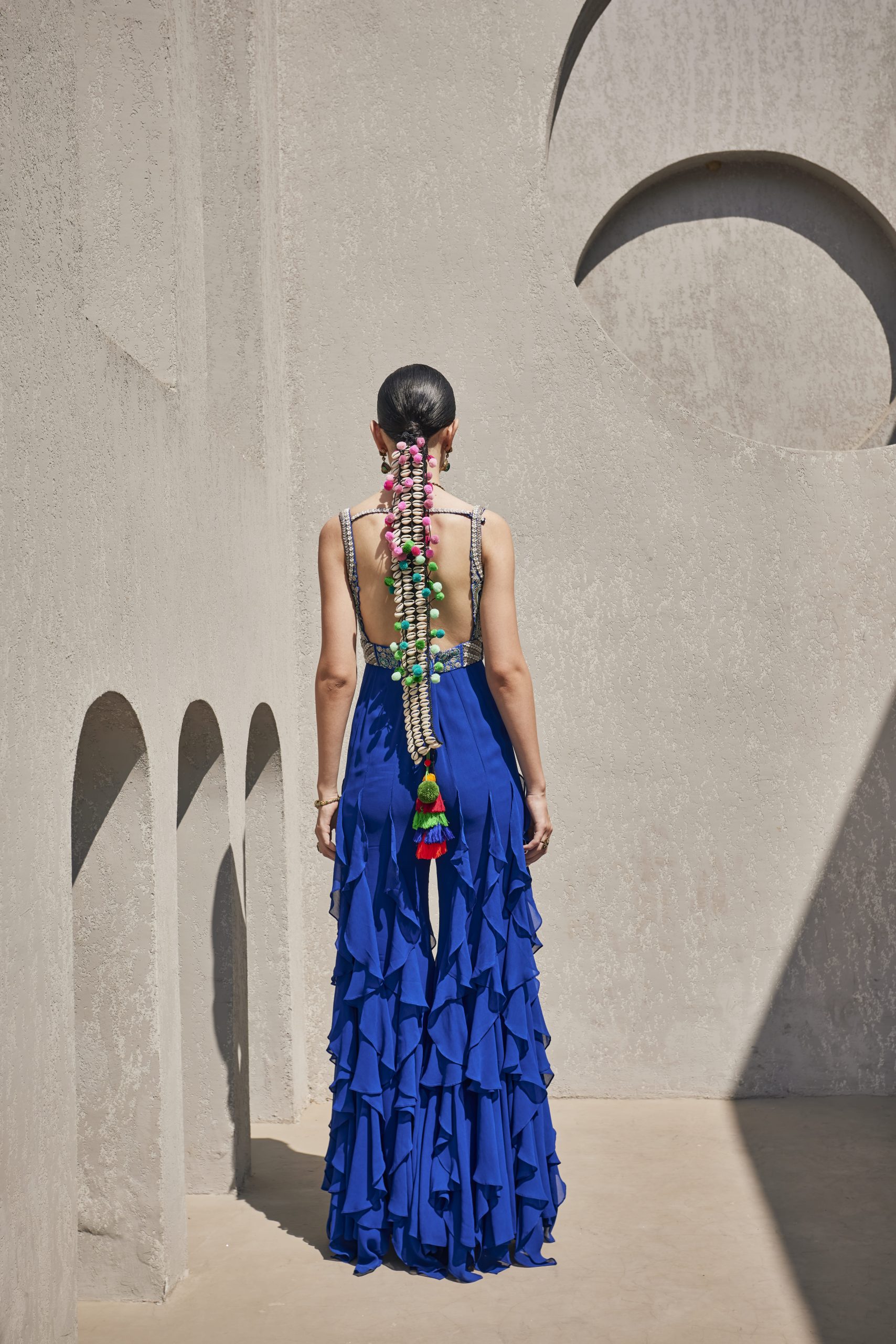 | Electric blue ruffled jumpsuit featuring a raw silk corset bodice, intricately embellished with our signature embroidery in tonal Kardhana, resham, glass beads, and drop-shaped pearls. |