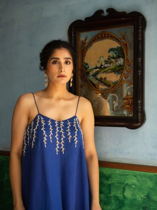 Blue leaf cut dana line embroidered flared jumpsuit with side pocket