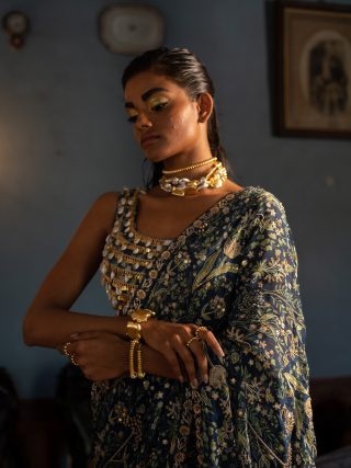 A navy blue pre–draped saree in our signature print with delicate embroidery embellishments and antique tone marodi work borders, and a highlighted pallu. It is paired with a heavily embellished blouse with kowri shells and golden tone sequins and our signature belt.