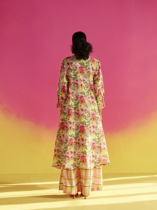 A linen straight kurta with contrast printed yoke, cuffs and pockets. Applique embroidery on the yoke and cuffs with bead highlights. Paired with a recycled cotton checkered pant and a chinnon crushed cotton dupatta finished with crochet lace along the edge.