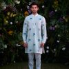Papyrus white hand block printed silk chanderi kurta and trousers.