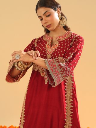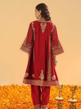 This ensemble is made from luxurious Silk Chanderi fabric and embellished with our Kirandori Embroidery with dabka zardozi. It showcases a zero neck design with a slit and three-quarter bell sleeves. The Choga is entirely embroidered with panels and is paired with an embroidered salwar. To complete the look, the Choga is accompanied by a Khada Dupatta, which features the same exquisite kirandori embroidery.