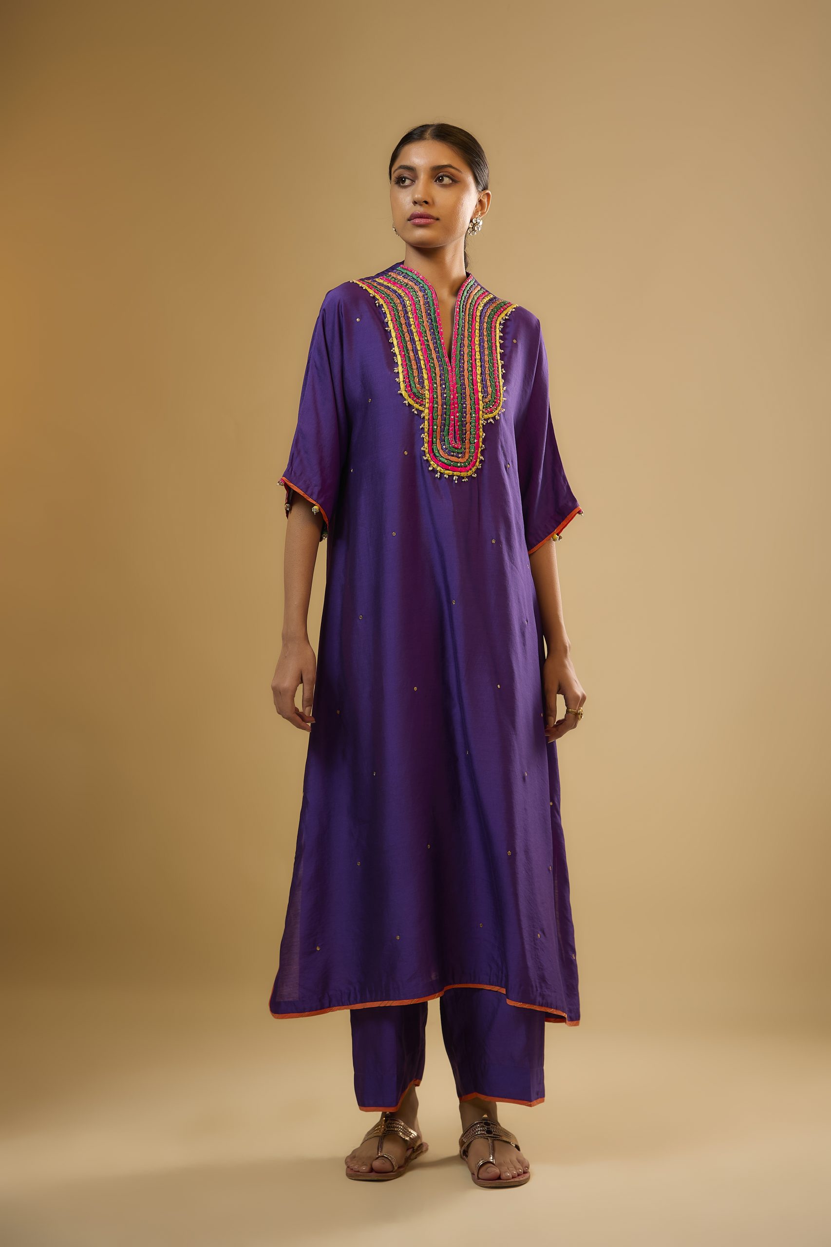 This 2 piece kurta set comes with multicolor embroidered neckline with tikki, zardosi embroidery and pearl hangings. To enhance the look it has sprinkles of tikki all over the kurta. It is paired with palazzo pants.
