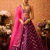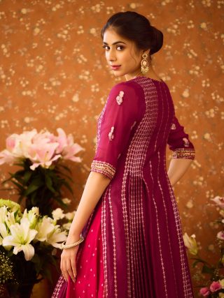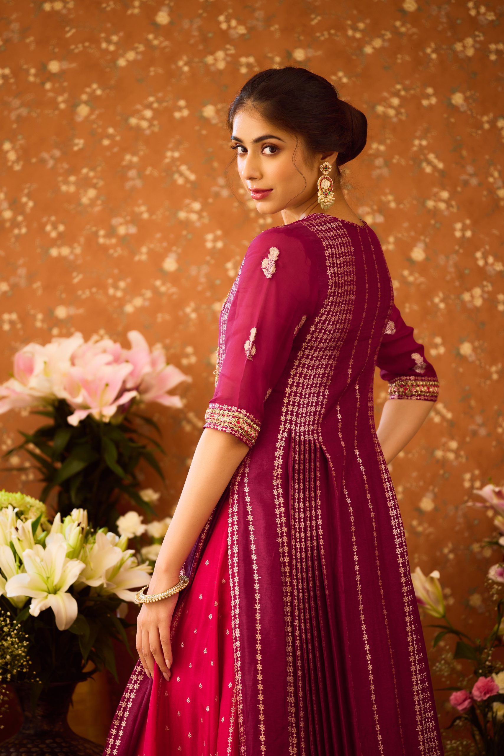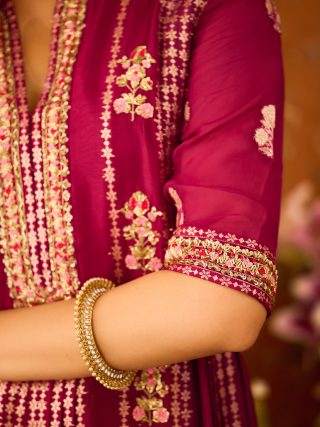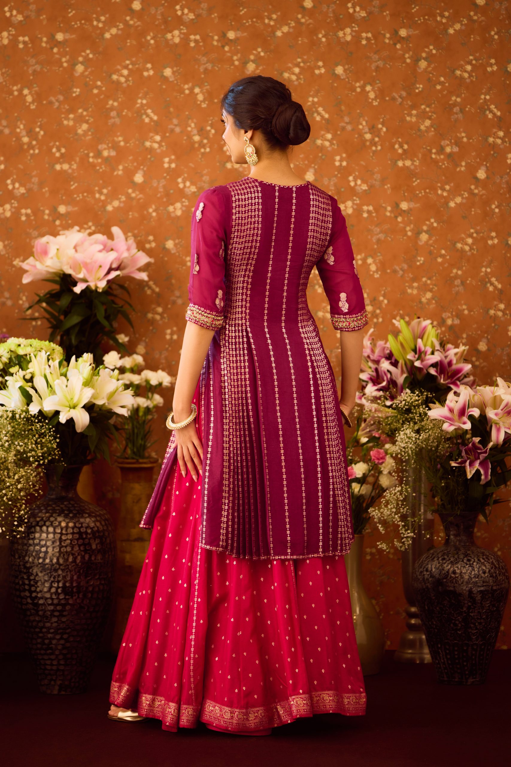 Scarlet purple hand embroidered pleated silk brocade kurta with brocade sharara and embroidered organza dupatta.