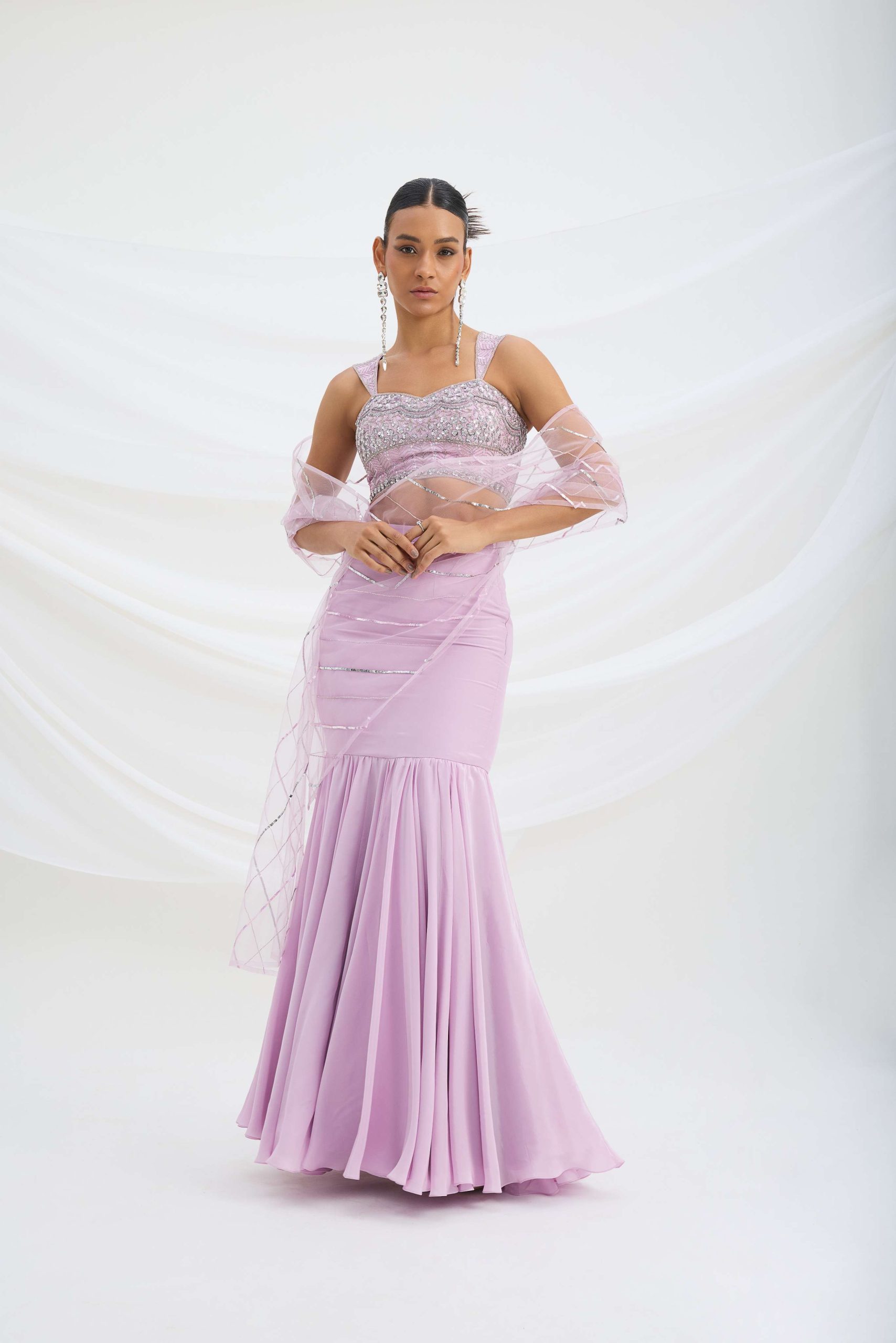 Lilac fishcut skirt with embroidered blouse and attached dupatta.