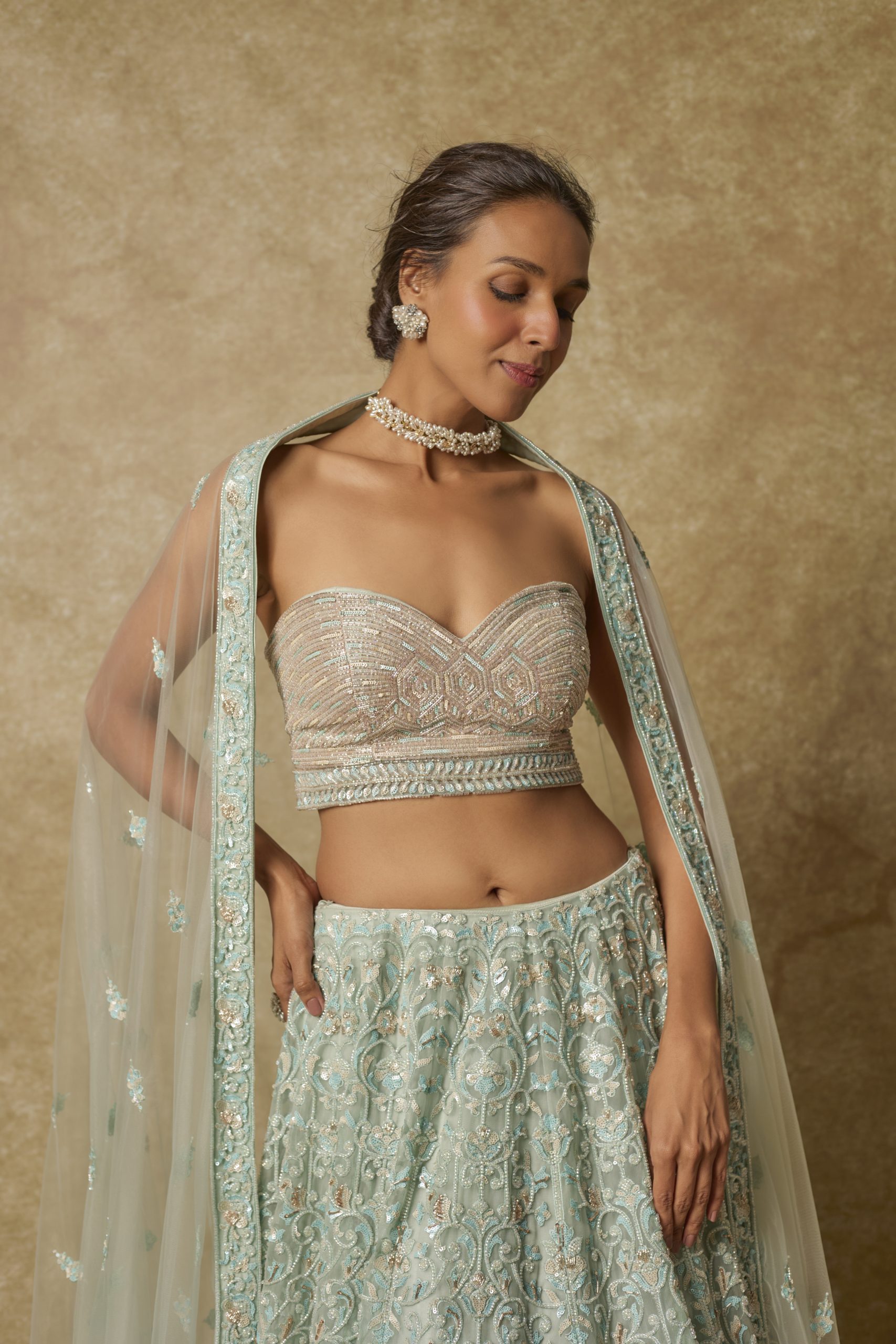 Featuring mint heavy embroidered lehenga in tulle with embroidered blouse in mashroo silk.