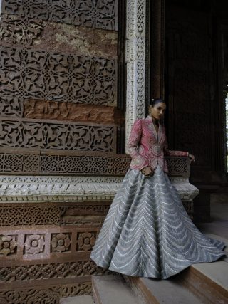 Featuring a jacket in silk base with zardosi embroidery. It is paired with an embroidered lehenga.