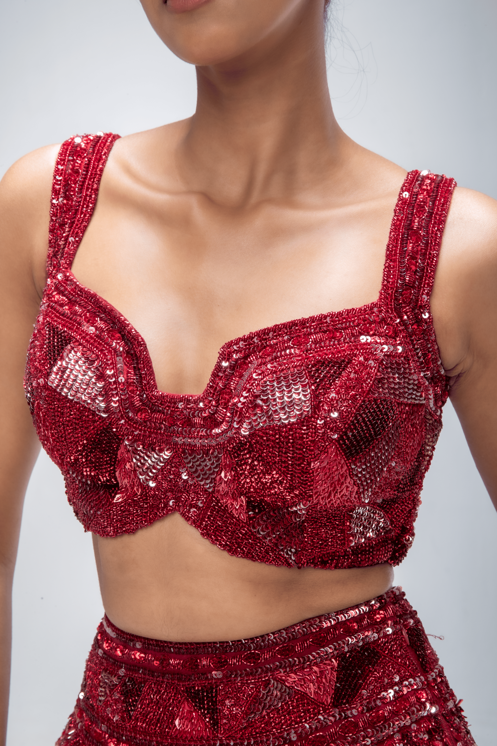 RUBY RED LEHENGA EMBELLISHED WITH SEQUIN WORK AND PAIRED WITH EMBROIDERED BLOUSE AND DUPATTA