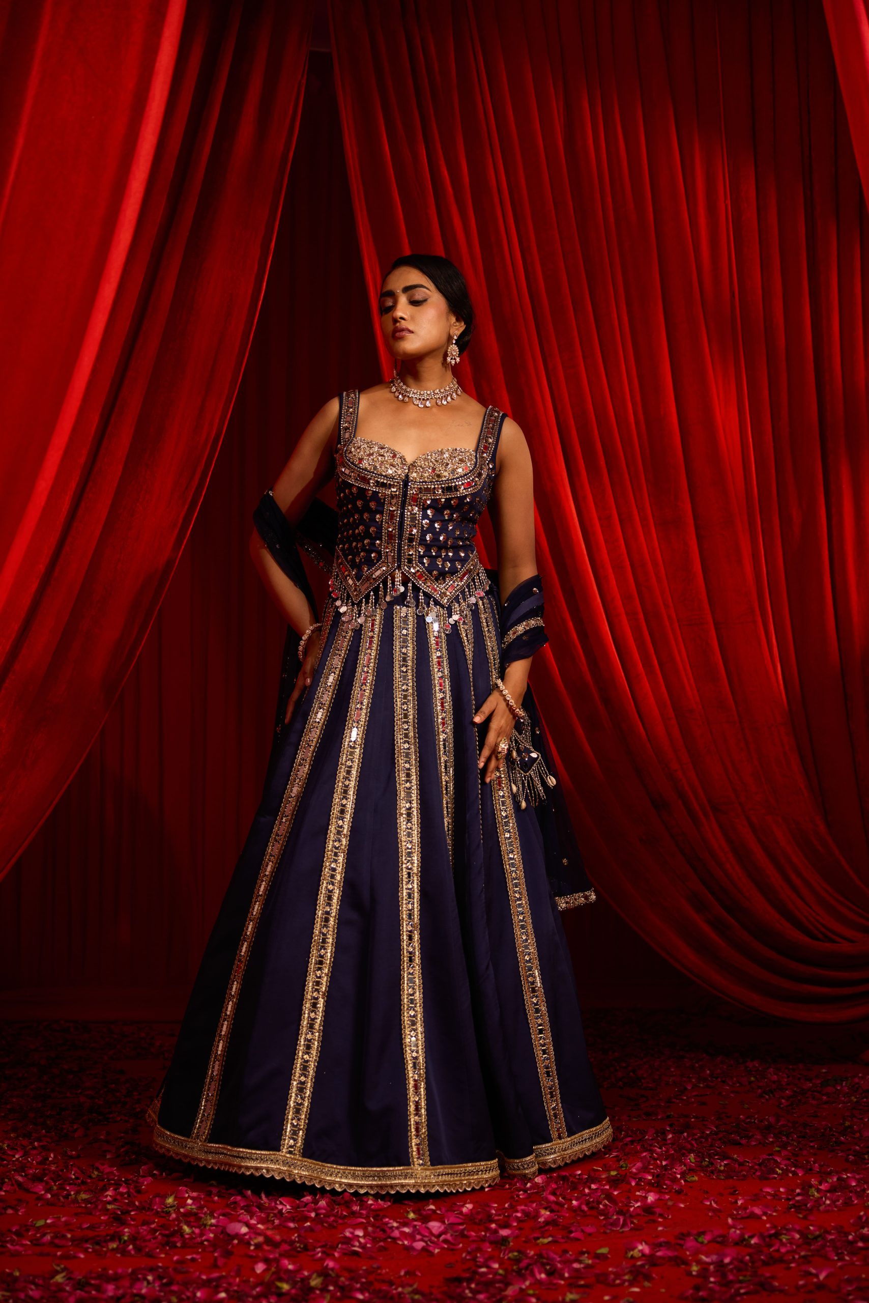 A regal royal blue lehenga set in satin featuring a structured corset-style blouse adorned with intricate mirror and zari detailing. The flared skirt is highlighted with vertical embellished panels that elongate the silhouette, finished with a delicately bordered hem. Perfect for sangeet nights, receptions, and grand celebrations.