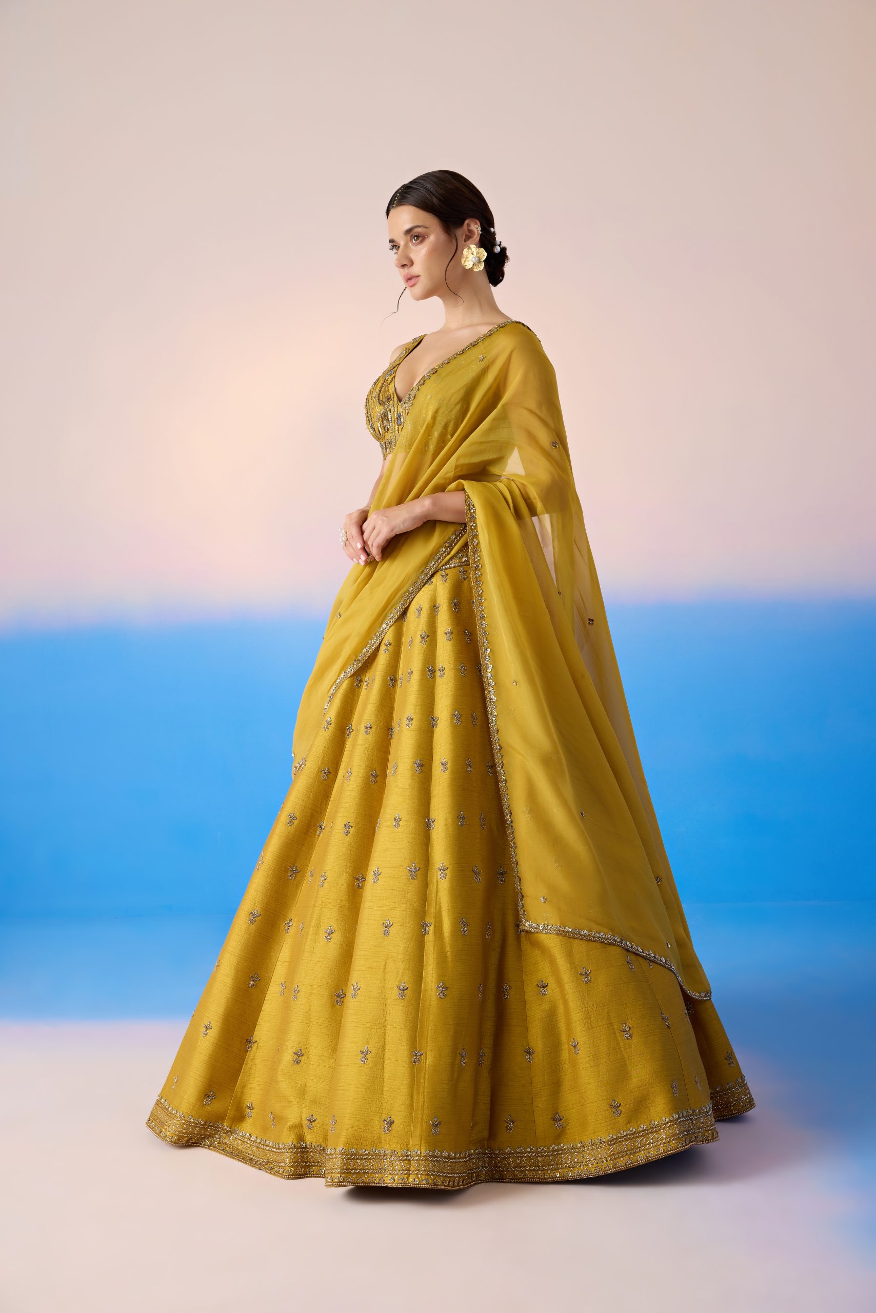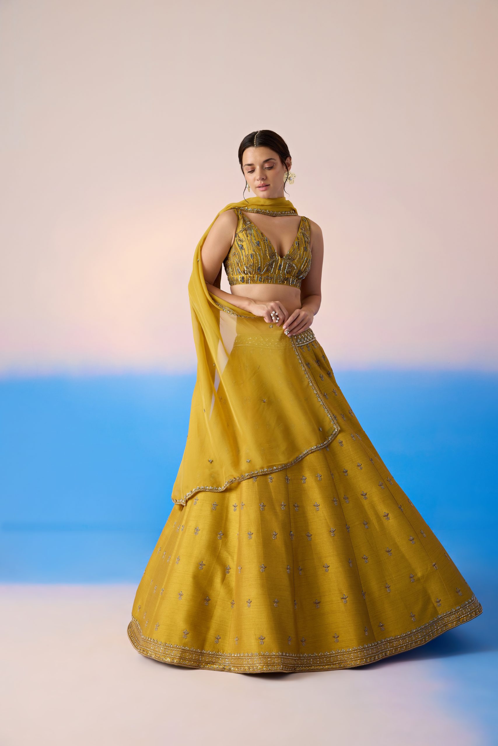 Mustard embroidered lehenga with blouse & dupatta.