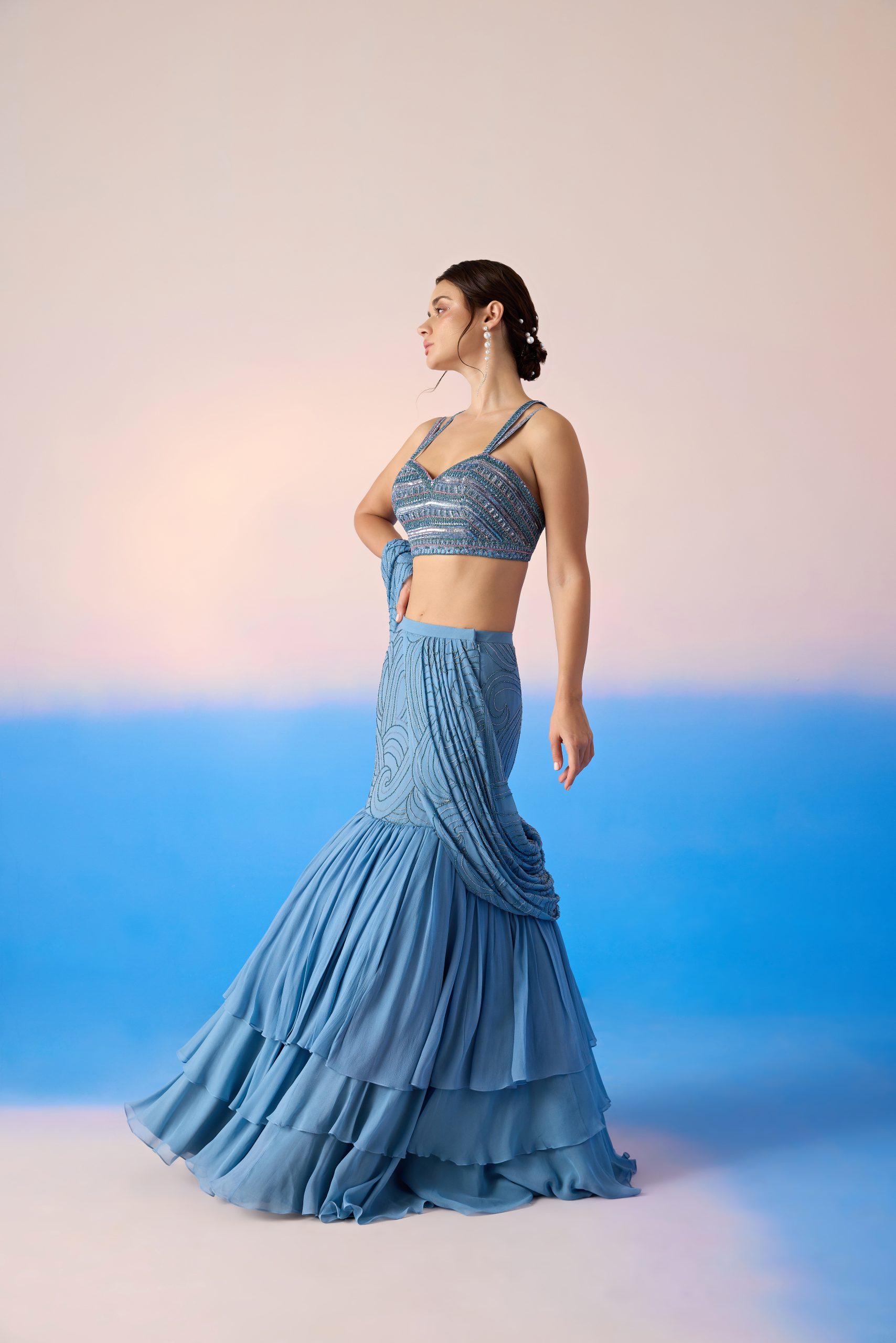 Heavy embroidered blouse with lehenga & attached dupatta.