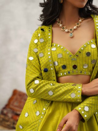 Stunning lime green dupion silk lehenga. The lime green color adds a touch of glamour and sophistication to your look, while the fabric ensures you feel comfortable all day or night long. It is styled with a lime green dupion silk blouse beautifully adorned in mirror and resham embroidery. Pair it with stylish dupion silk jacket with mirror and resham embroidery.