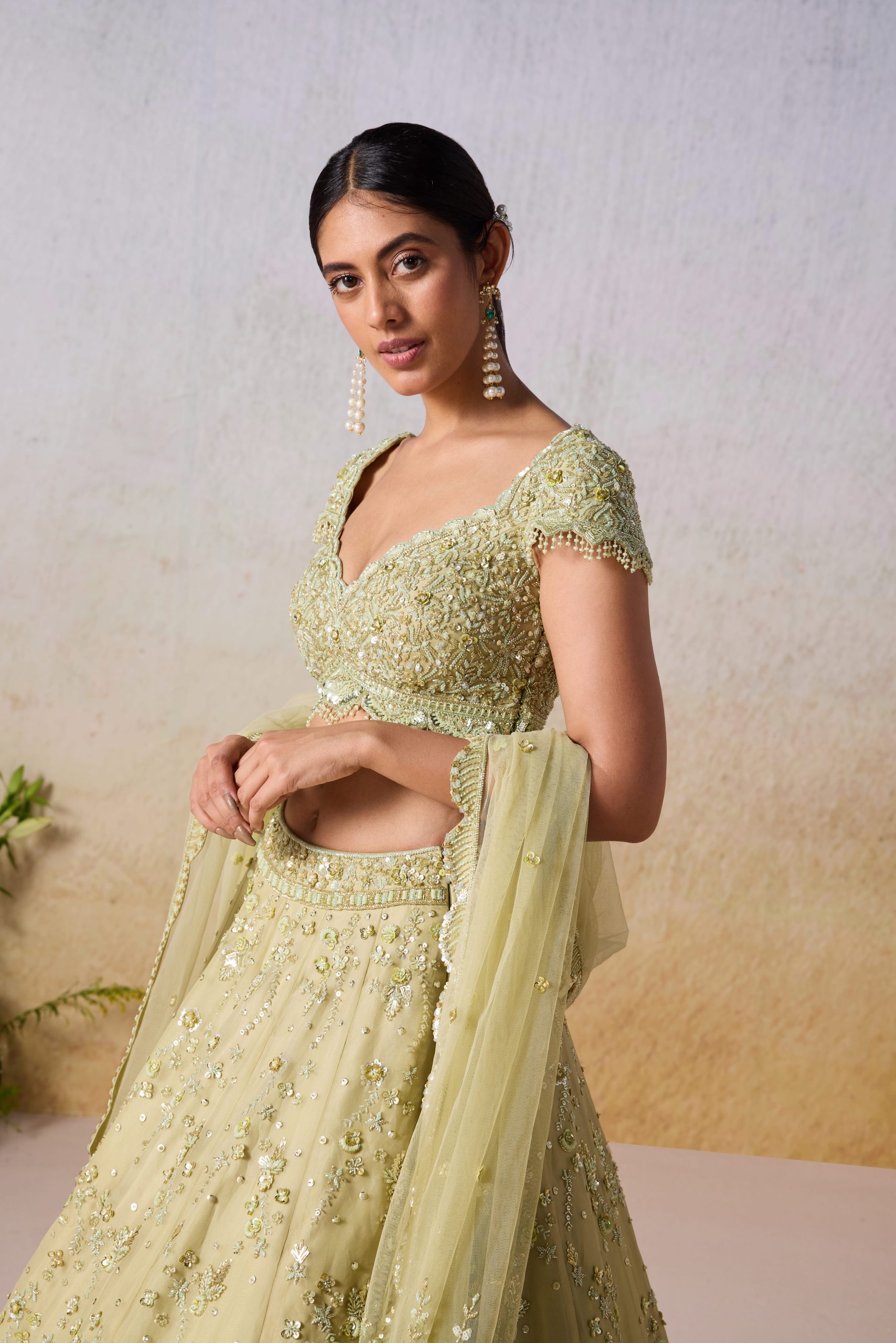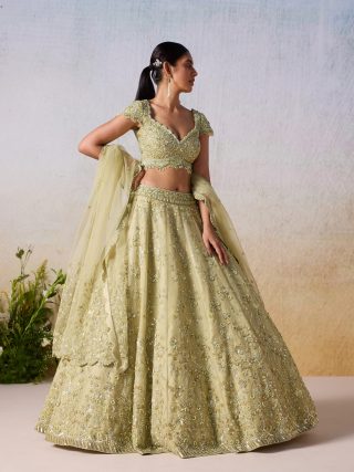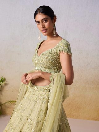 Tone On Tone With Gold Embellishment Adorned With Cutwork And Scallops On The Edge Of Blouse And Lehenga Followed By Floral Motifs All Over Along With The Detailing Of Tassels On Cap Sleeves And Blouse Hem.