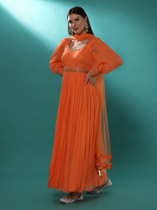 Orange georgette anarkali is delicately embroidered using sequins, beads, pearls and zari. This anarkali is paired with a net dupatta.