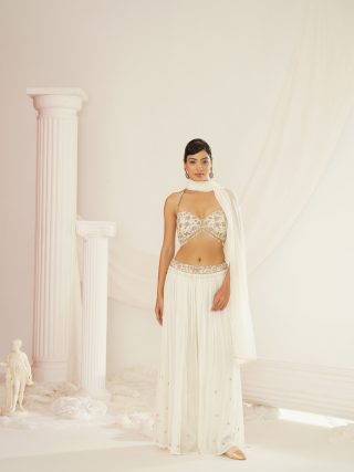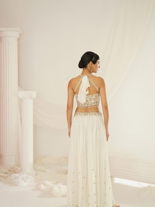 Kapda Dori’s stunning Ivory geogratte fabric pallazo set, beautifully adorned with cutdana, sequence, dabka and pearl embroidery. The pallazo features a full-length flared look with gathers on waist. The Ivory color adds a touch of glamour and sophistication to your look, while the fabric texture ensures you feel comfortable all day or night long. It is styled with a Ivory halter neck choli adorned with hand embroidery with pearls, crystals, sequens and dabka. It is paired with geogratte dupatta.