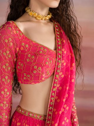This pink printed lehenga is highlighted with cutdana embroidery. It is paired with a matching dupatta and blouse.