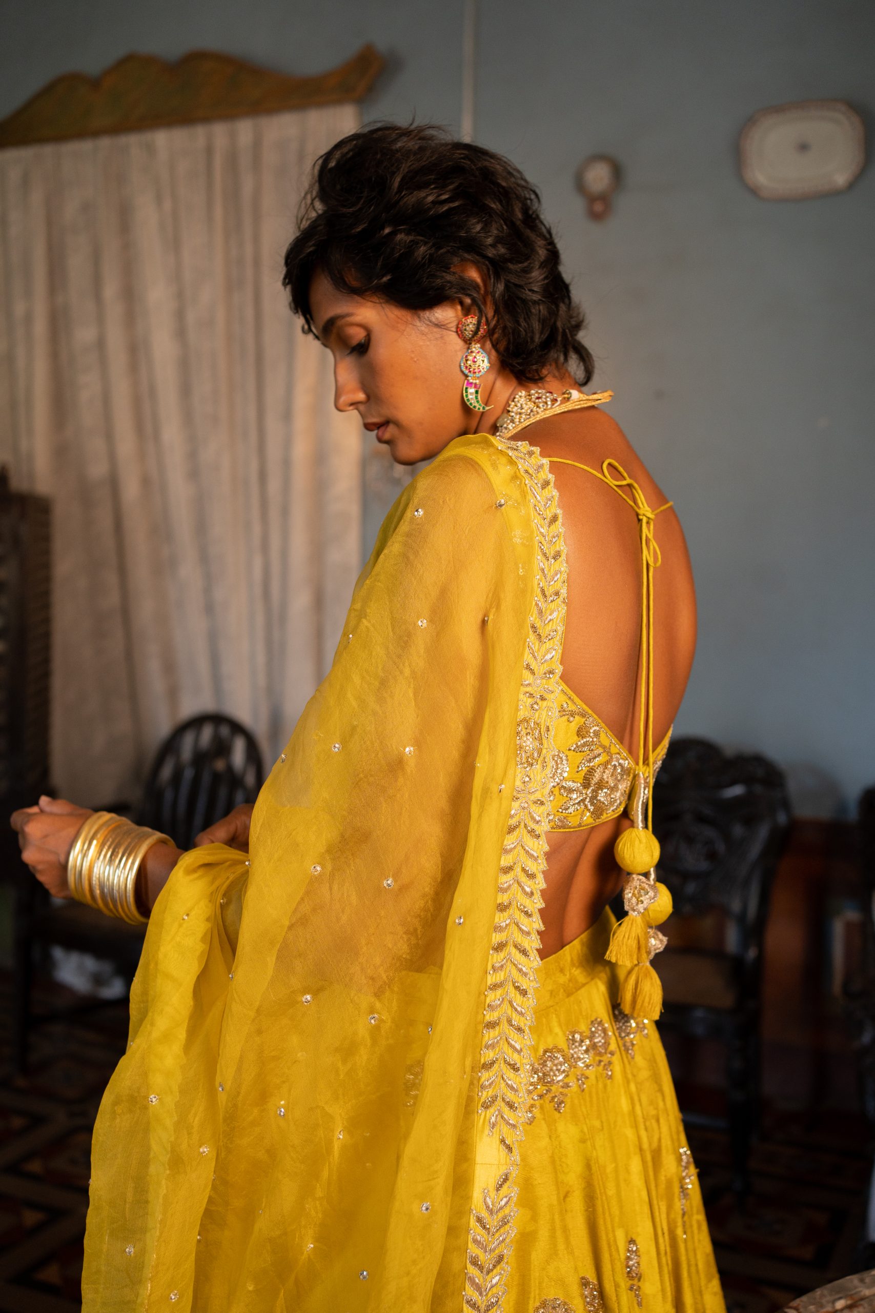 A lime yellow self–woven russian jacquard lehenga set paired with antique silver zari jaal embroidered blouse and pure tissue dupatta.