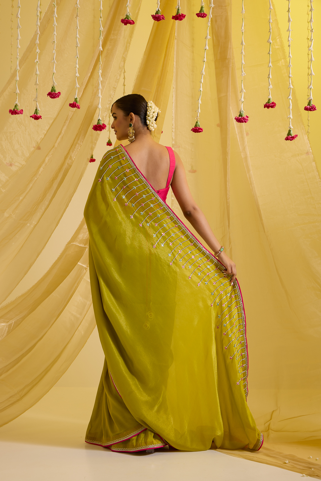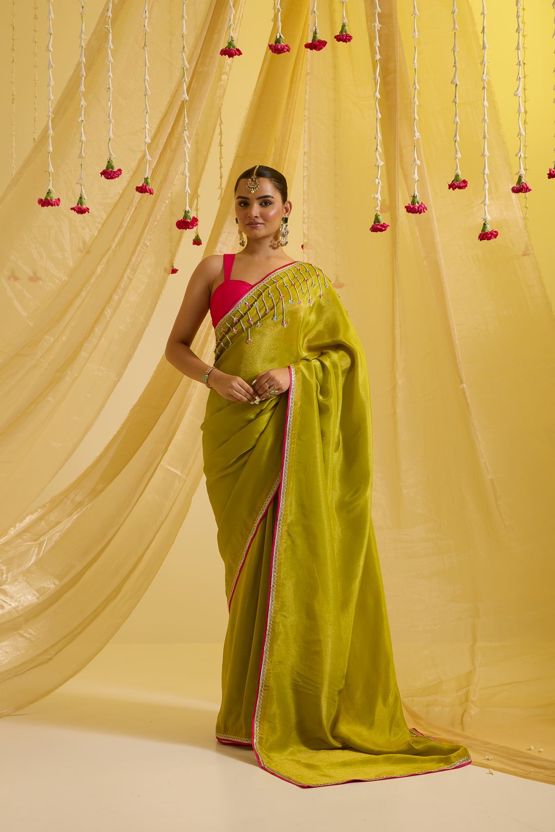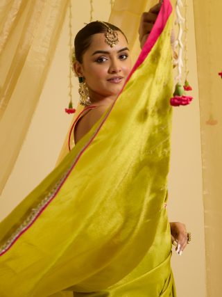 Featuring here a lime green predraped saree having hand embroidery on the palla with fuscia pink and gold detailings on the border of the saree. It is paired up with a fuscia pink silk blouse to enhance the look.