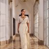 This stunning saree in silver color has overall embroidery on the garment. It has slit on the skirt and very stylish very different kind of palla.