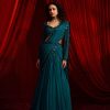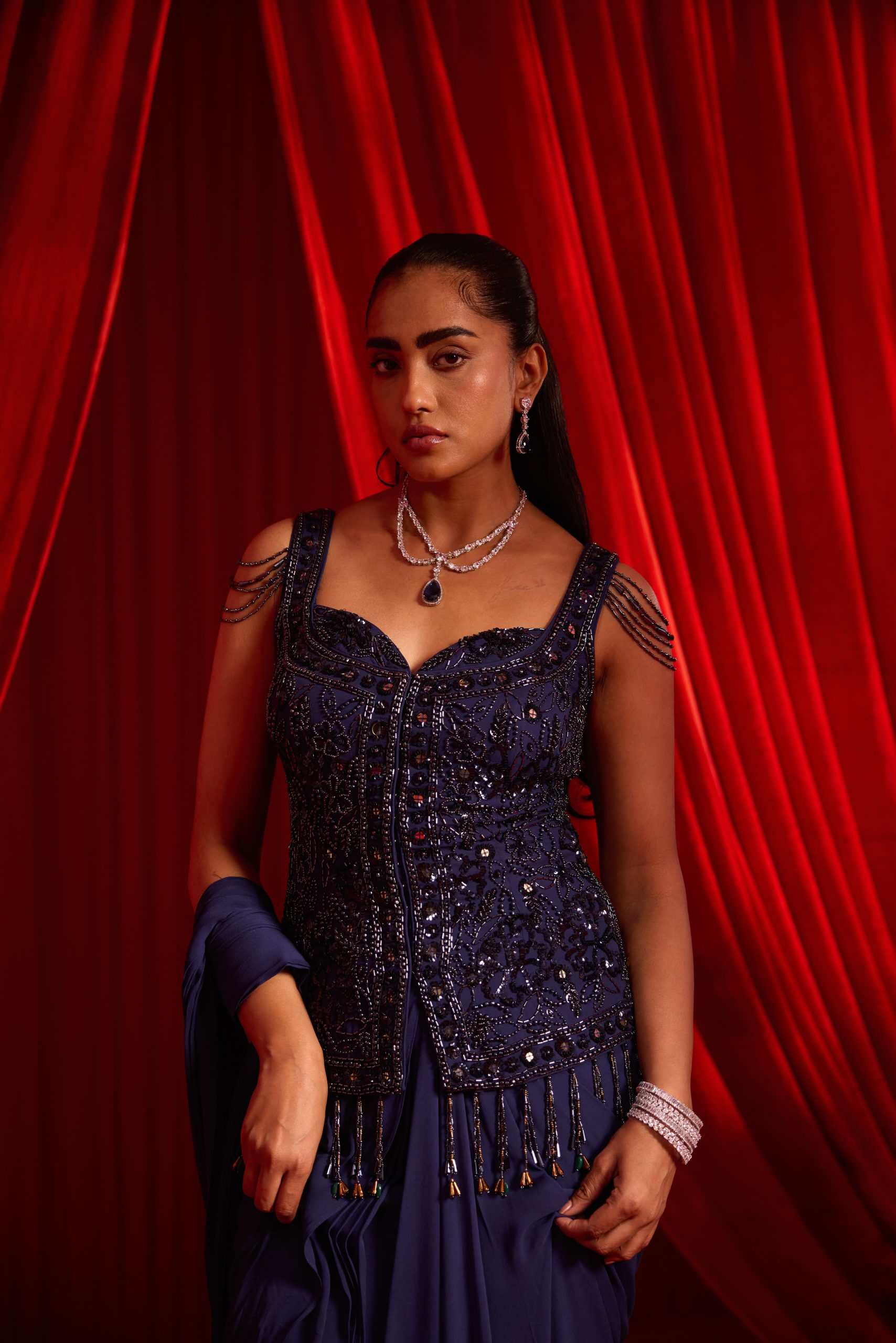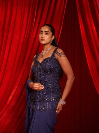Crafted in fluid georgette, this drape saree features a contemporary front pallu silhouette for a modern, sculpted look. The intricately embellished blouse adds depth and glamour, while the soft drape enhances effortless movement. A statement ensemble perfect for cocktail evenings and wedding celebrations.