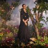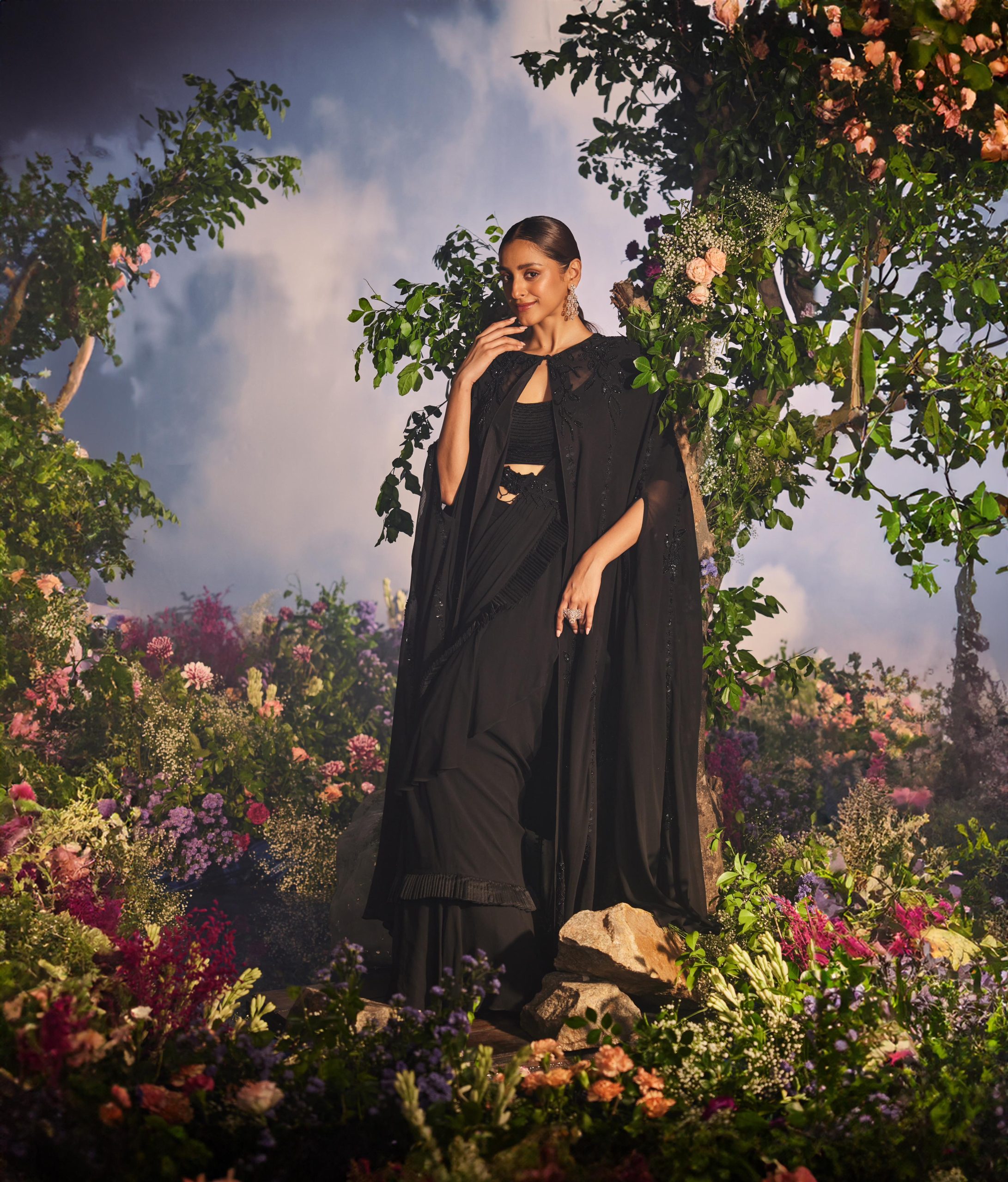 Black ruffle saree with a contemporary twist Intricately placed ruffles create a cascading effect for volume and movement. Pleats at the edge of the pallu add structure and contrast to the ruffles. Whimsical feminine embroidery motif on the cape blouse and belt. Exudes elegance and sophistication Stunning visual display with the combination of ruffles, pleats, and embroidery.