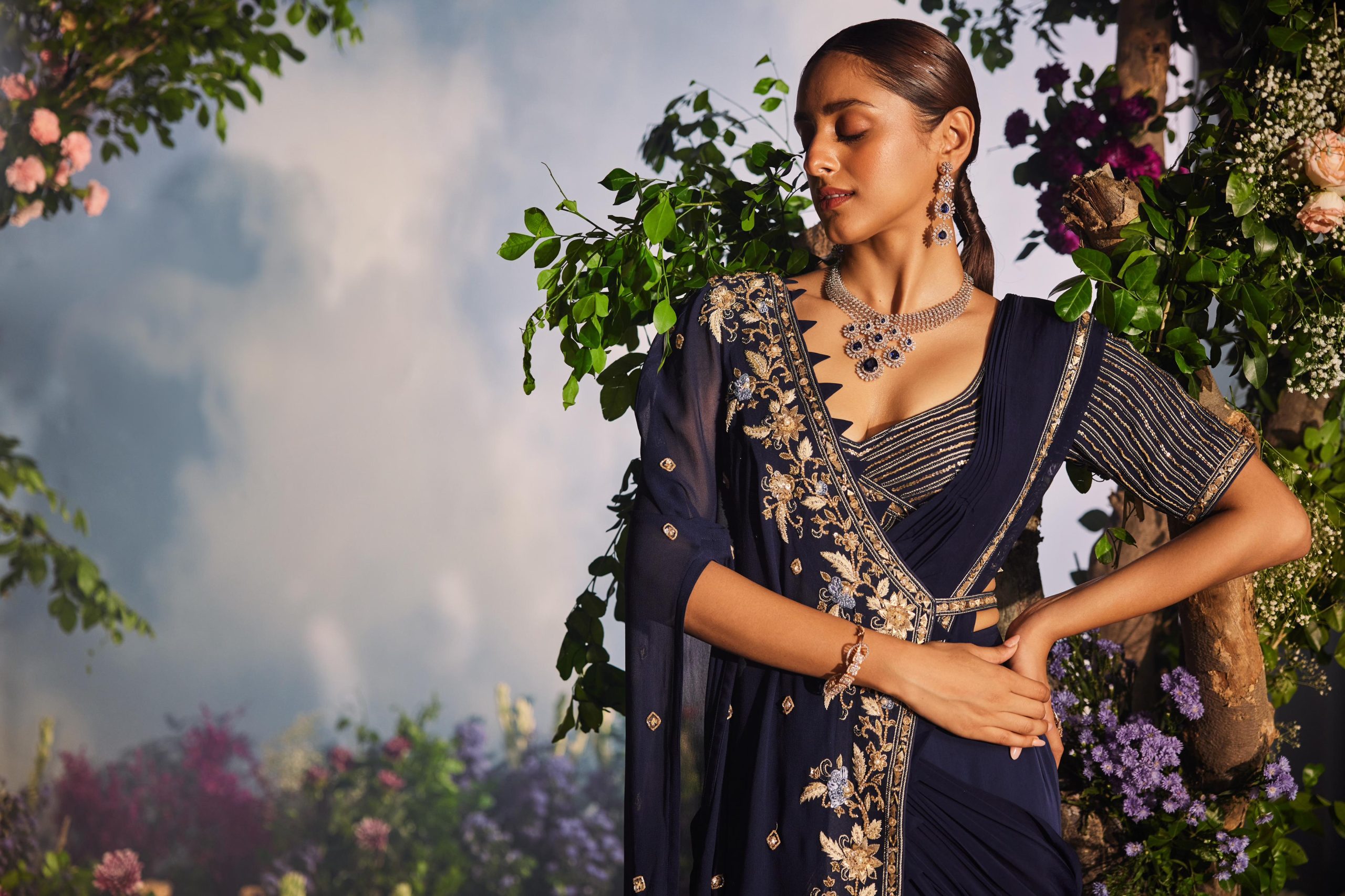 This navy blue drape lehenga is paired with a beautifully designed blouse and a half cape, both of which feature exquisite detailing. The blouse and cape are adorned with intricate embroidery, including threadwork, sequins, and cutdana, creating a distinctive and luxurious appearance that stands out from traditional draped sarees. The ensemble is further enhanced by an attached waist belt that integrates seamlessly with the cape, providing a polished and refined silhouette. This design skillfully combines traditional elements with a modern aesthetic.