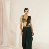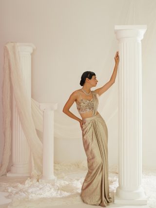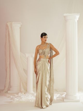 Kapda Dori’s stunning gold ready to wear sandwash satin saree. The Gold color adds a touch of glamour and sophistication to your look, while the soft satin fabric ensures you feel comfortable all day or night long. It is styled with a gold net blouse fully embroidered with cutdana, stones and sequins.