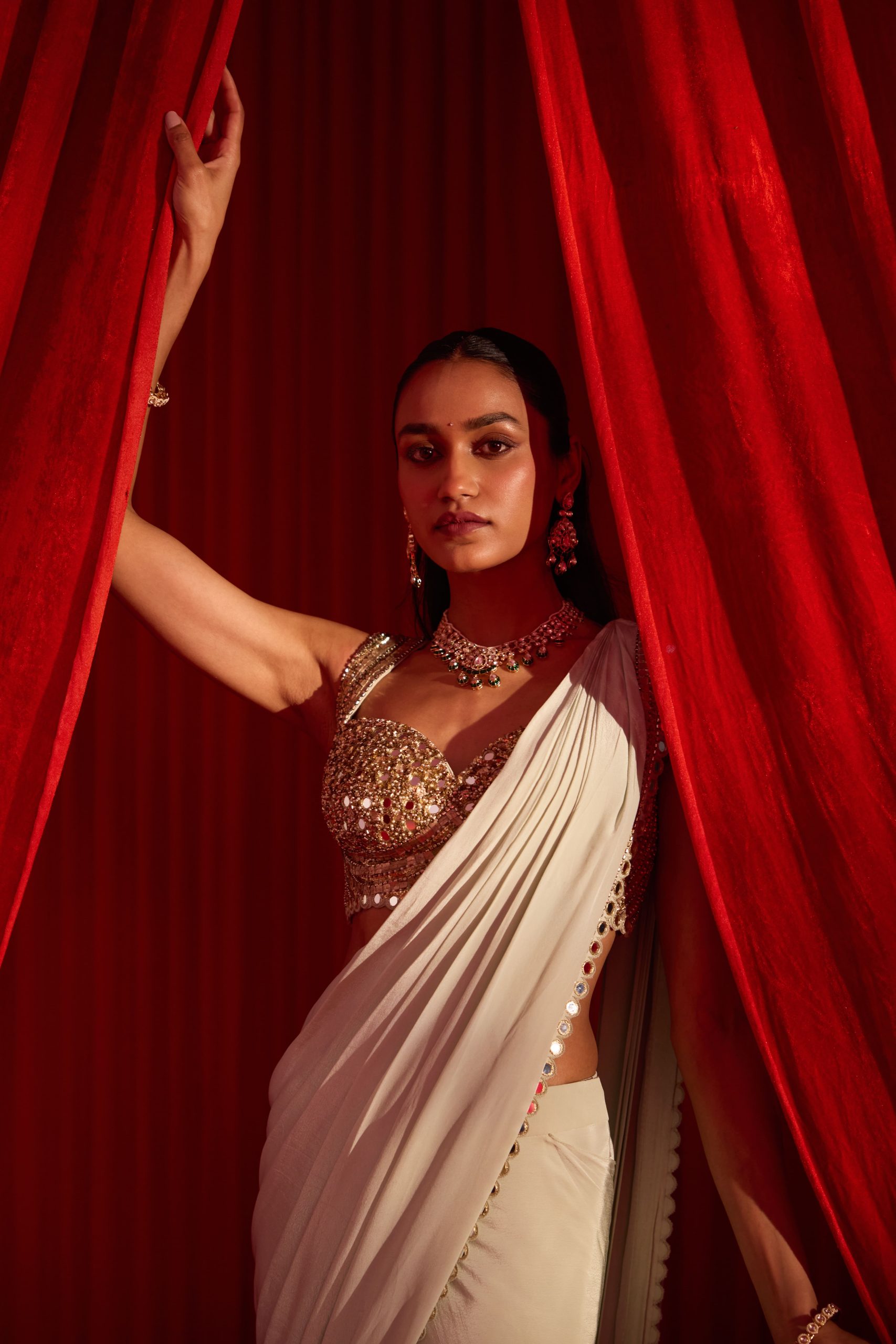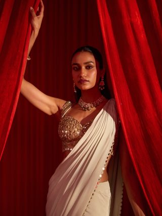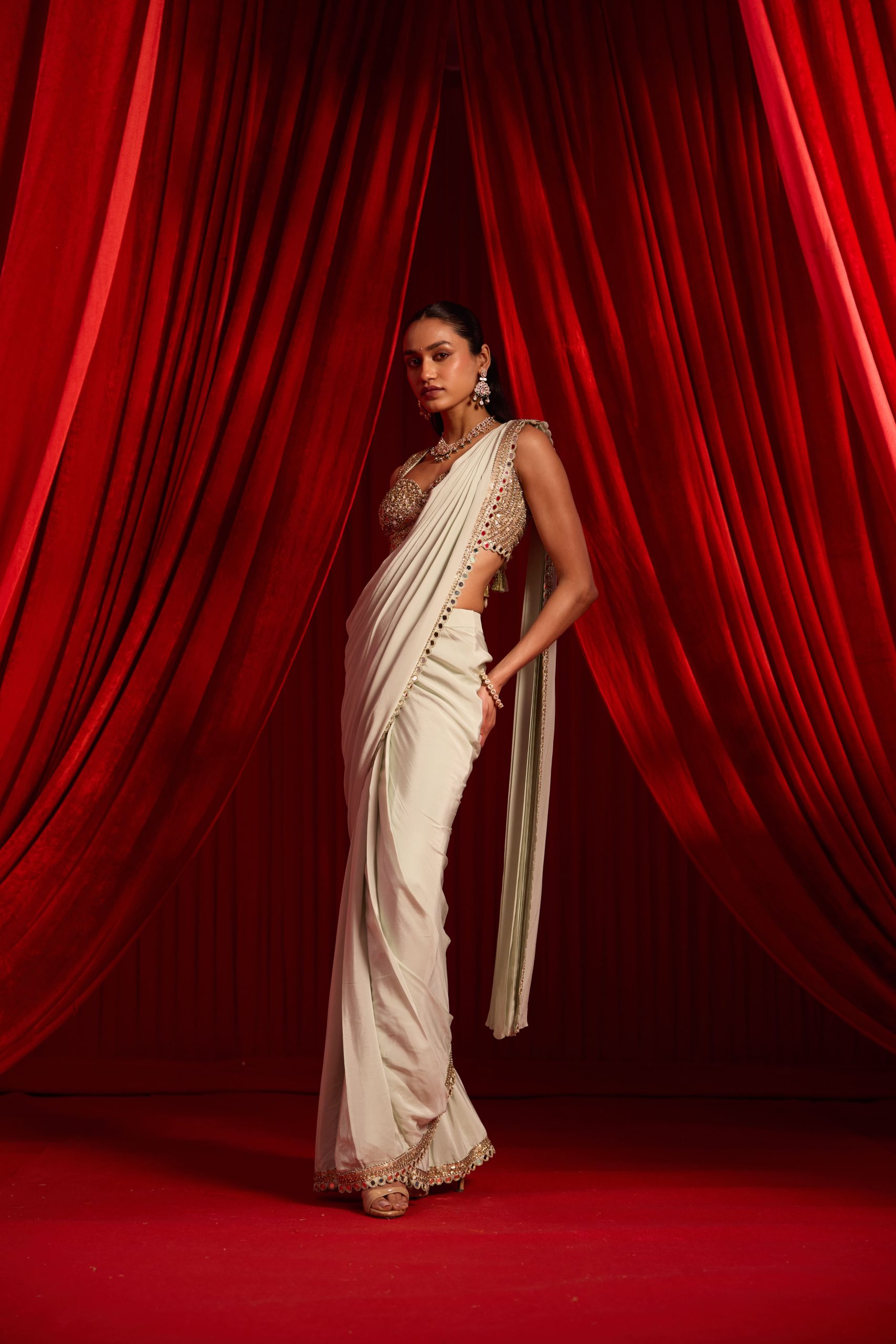 Iktar sage green drape saree in crepe is paired with an intricate embellished sequined blouse featuring cut‑work and mirror detailing. Blouse is padded and have back hook closure .