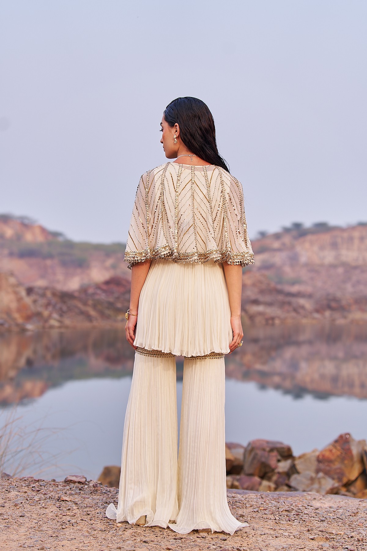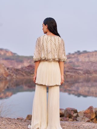 Firdose embellished sharara in georgette comes with a short kurta which is hand crafted with sequence , beads and pipe work. It has a flattering u wide neckline and have a side zip closure. Outfit completes with embroidered georgette cape with tassel detailing.